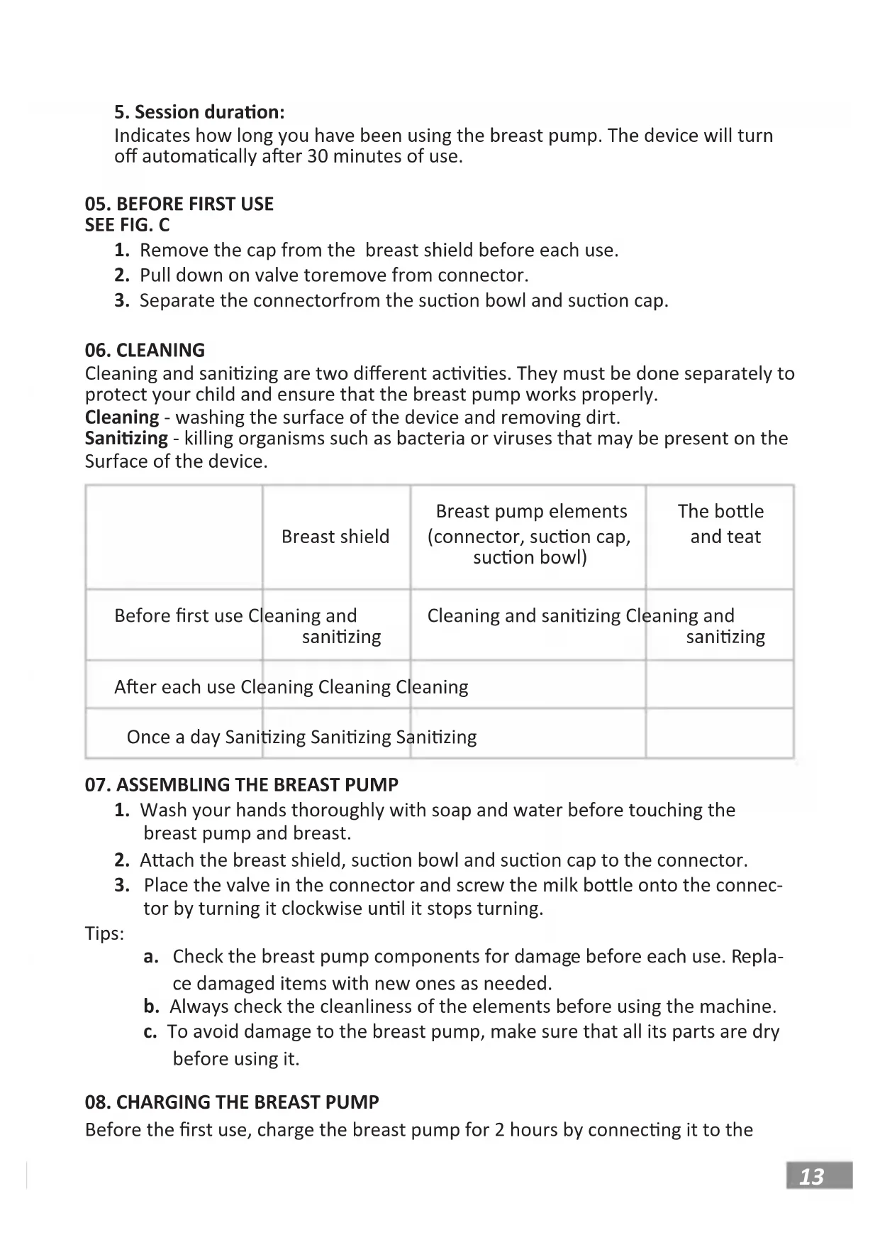 tor by turning it clockwise unl it stops turning. Tips: a. Check the breast pump components for damage before each use. Repla- ce damaged items with new ones as needed. b. Always check the cleanliness of the elements before using the machine. c. To avoid damage to the breast pump, make sure that all its parts are dry before using it.