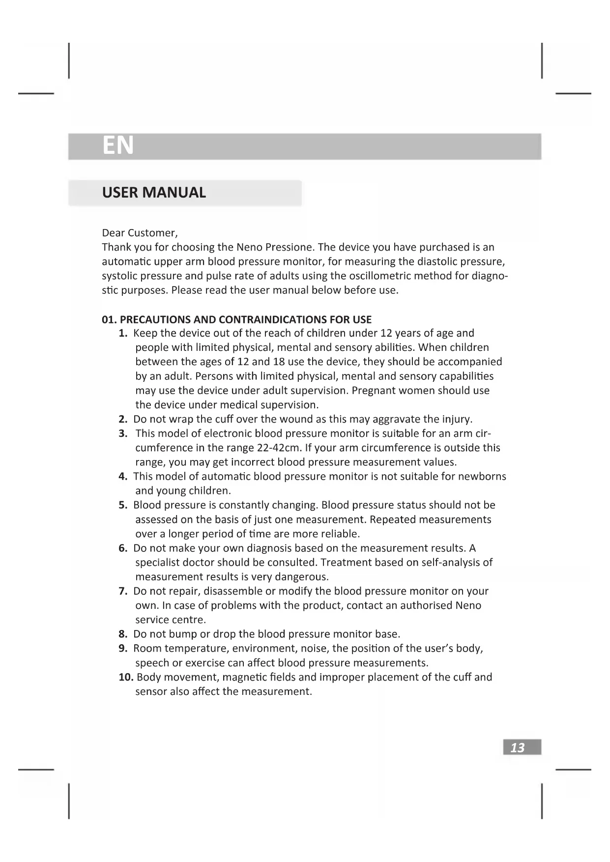 USER MANUAL Dear Customer, Thank you for choosing the Neno Pressione. The device you have purchased is an automac upper arm blood pressure monitor, for measuring the diastolic pressure, systolic pressure and pulse rate of adults using the oscillometric method for diagno- sc purposes. Please read the user manual below before use.