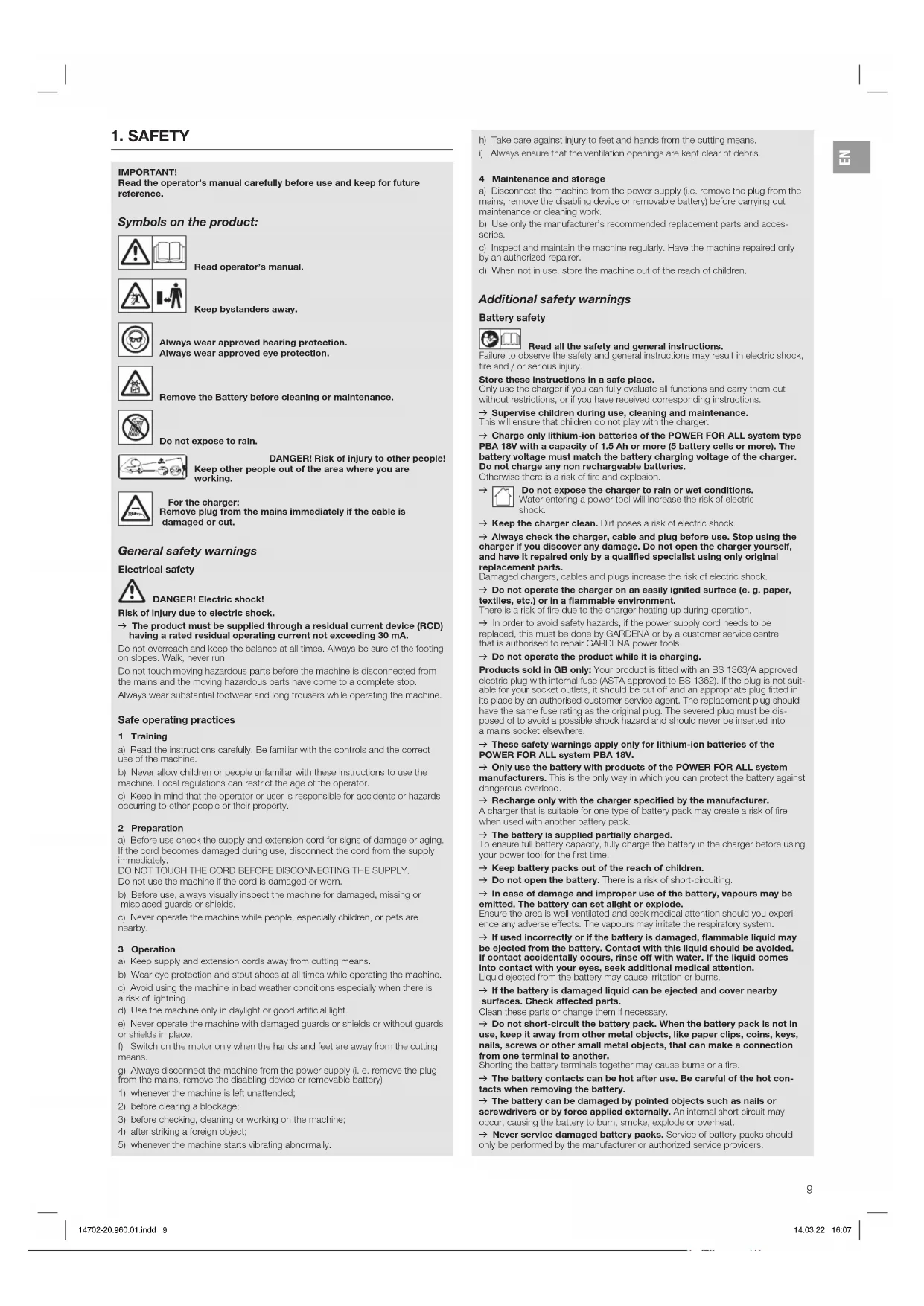 14702-20.960.01.indd 814702-20.960.01.indd 8 14.03.22 16:0714.03.22 16:071. SAFETY IMPORTANT! Read the operator’s manual carefully before use and keep for future reference. Symbols on the product: Read operator’s manual. Keep bystanders away. Always wear approved hearing protection. Always wear approved eye protection. Remove the Battery before cleaning or maintenance. Do not expose to rain. DANGER! Risk of injury to other people! Keep other people out of the area where you are working. For the charger: Remove plug from the mains immediately if the cable is damaged or cut. General safety warnings Electrical safety DANGER! Electric shock!Risk of injury due to electric shock.v The product must be supplied through a residual current device (RCD) having a rated residual operating current not exceeding 30 mA.Do not overreach and keep the balance at all times. Always be sure of the footing on slopes. Walk, never run.Do not touch moving hazardous parts before the machine is disconnected from the mains and the moving hazardous parts have come to a complete stop.Always wear substantial footwear and long trousers while operating the machine. Safe operating practices 1 Traininga) Read the instructions carefully. Be familiar with the controls and the correct use of the machine.b) Never allow children or people unfamiliar with these instructions to use the machine. Local regulations can restrict the age of the operator.c) Keep in mind that the operator or user is responsible for accidents or hazards occurring to other people or their property.2 Preparationa) Before use check the supply and extension cord for signs of damage or aging. If the cord becomes damaged during use, disconnect the cord from the supply immediately. DO NOT TOUCH THE CORD BEFORE DISCONNECTING THE SUPPLY. Do not use the machine if the cord is damaged or worn.b) Before use, always visually inspect the machine for damaged, missing or misplaced guards or shields.c) Never operate the machine while people, especially children, or pets are nearby.3 Operationa) Keep supply and extension cords away from cutting means.b) Wear eye protection and stout shoes at all times while operating the machine.c) Avoid using the machine in bad weather conditions especially when there is arisk of lightning.d) Use the machine only in daylight or good artificial light.e) Never operate the machine with damaged guards or shields or without guards or shields in place.f) Switch on the motor only when the hands and feet are away from the cutting means.g) Always disconnect the machine from the power supply (i. e. remove the plug from the mains, remove the disabling device or removable battery)1) whenever the machine is left unattended;2) before clearing a blockage;3) before checking, cleaning or working on the machine;4) after striking a foreign object;5) whenever the machine starts vibrating abnormally.h) Take care against injury to feet and hands from the cutting means.i) Always ensure that the ventilation openings are kept clear of debris.4 Maintenance and storagea) Disconnect the machine from the power supply (i.e. remove the plug from the mains, remove the disabling device or removable battery) before carrying out maintenance or cleaning work.b) Use only the manufacturer’s recommended replacement parts and acces-sories.c) Inspect and maintain the machine regularly. Have the machine repaired only by an authorized repairer.d) When not in use, store the machine out of the reach of children. Additional safety warnings Battery safety Read all the safety and general instructions.Failure to observe the safety and general instructions may result in electric shock, fire and / or serious injury.Store these instructions in a safe place. Only use the charger if you can fully evaluate all functions and carry them out without restrictions, or if you have received corresponding instructions.v Supervise children during use, cleaning and maintenance. This will ensure that children do not play with the charger.v Charge only lithium-ion batteries of the POWER FOR ALL system type PBA 18V with a capacity of 1.5 Ah or more (5 battery cells or more). The battery voltage must match the battery charging voltage of the charger. Do not charge any non rechargeable batteries. Otherwise there is a risk of fire and explosion. Do not expose the charger to rain or wet conditions. Water entering a power tool will increase the risk of electric shock.v Keep the charger clean. Dirt poses a risk of electric shock.v Always check the charger, cable and plug before use. Stop using the charger if you discover any damage. Do not open the charger yourself, and have it repaired only by a qualified specialist using only original replacement parts. Damaged chargers, cables and plugs increase the risk of electric shock.v Do not operate the charger on an easily ignited surface (e. g. paper, textiles, etc.) or in a flammable environment. There is a risk of fire due to the charger heating up during operation.v In order to avoid safety hazards, if the power supply cord needs to be replaced, this must be done by GARDENA or by a customer service centre that is authorised to repair GARDENA power tools.v Do not operate the product while it is charging.Products sold in GB only: Your product is fitted with an BS 1363/A approved electric plug with internal fuse (ASTA approved to BS 1362). If the plug is not suit-able for your socket outlets, it should be cut off and an appropriate plug fitted in its place by an authorised customer service agent. The replacement plug should have the same fuse rating as the original plug. The severed plug must be dis-posed of to avoid a possible shock hazard and should never be inserted into amains socket elsewhere.v These safety warnings apply only for lithium-ion batteries of the POWER FOR ALL system PBA 18V.v Only use the battery with products of the POWER FOR ALL system manufacturers. This is the only way in which you can protect the battery against dangerous overload.v Rec