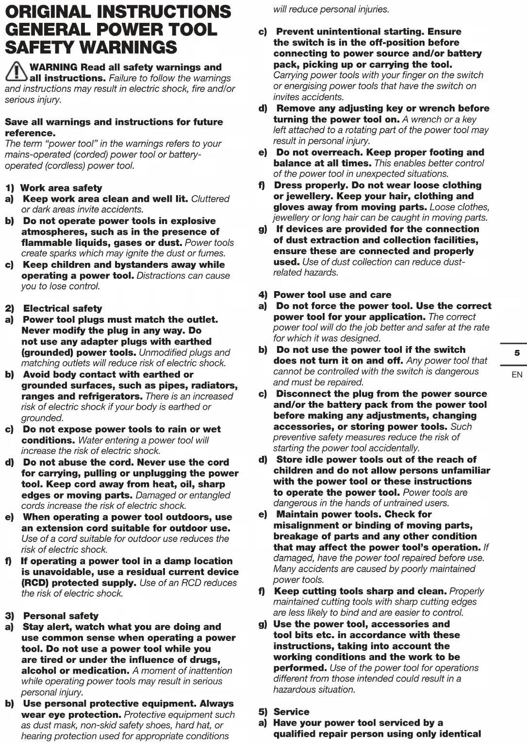 SAFETY WARNINGS WARNING Read all safety warnings and all instructions. Failure to follow the warnings and instructions may result in electric shock, fire and/or serious injury. Save all warnings and instructions for future reference. The term “power tool” in the warnings refers to your mains-operated (corded) power tool or battery- operated (cordless) power tool.