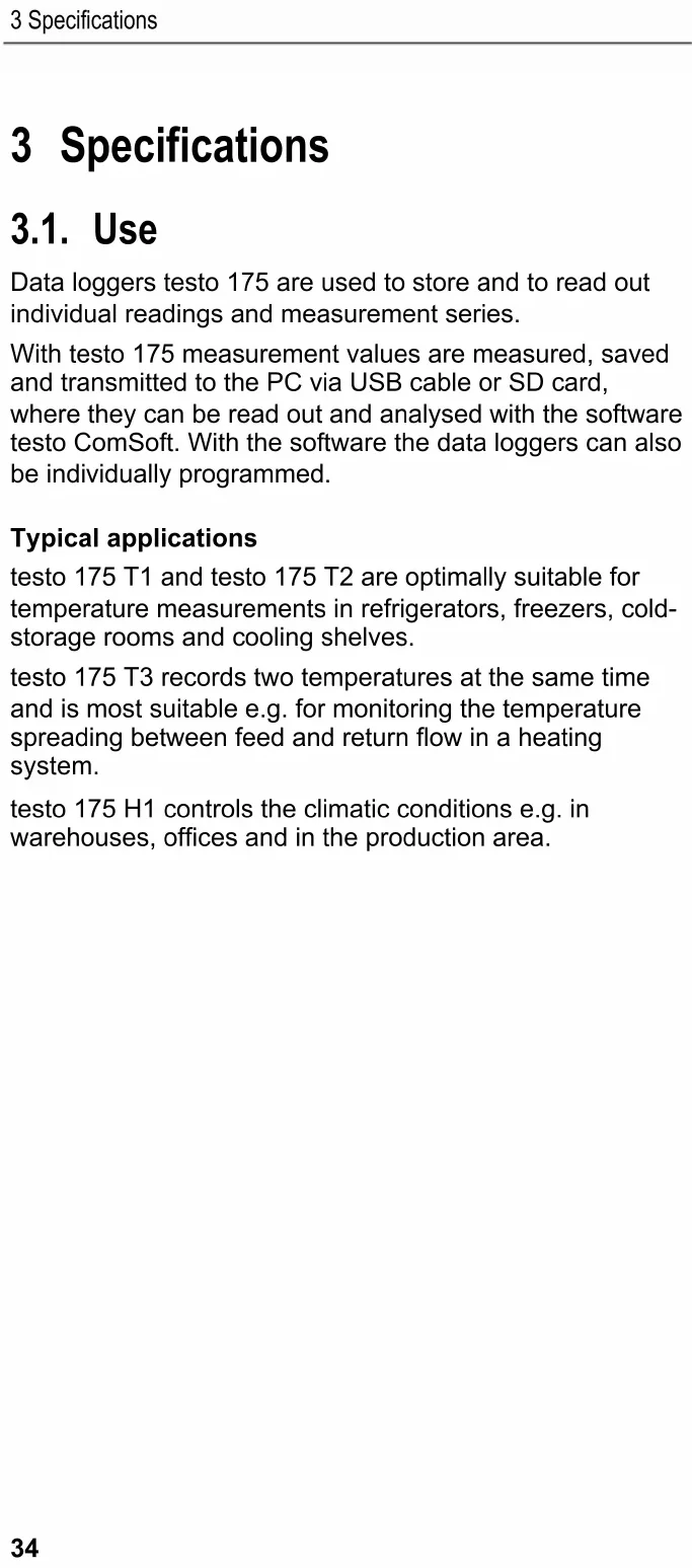 Pos: 16 /TD/Überschr iften/3. Leistungs beschreibung @ 0\mod_11737 74791554_79.doc @ 301 @ 1 3 Specifications Pos: 17 /TD/Überschr iften/3.1 Verwendung @ 0\mod_1176211016437_ 79.doc @ 695 @ 2 3.1. Use Pos: 18 /TD/Leistungsb eschreibung/Ver wendung/testo 175 @ 6\mod_1 274950423499_79. doc @ 61883 @ 5 Data loggers testo 175 are used to store and to read out individual readings and measurement series. With testo 175 measurement values are measured, saved and transmitted to the PC via USB cable or SD card, where they can be read out and analysed with the software testo ComSoft. With the software the data loggers can also be individually programmed. Typical applications testo 175 T1 and testo 175 T2 are optimally suitable for temperature measurements in refrigerators, freezers, cold- storage rooms and cooling shelves. testo 175 T3 records two temperatures at the same time and is most suitable e.g. for monitoring the temperature spreading between feed and return flow in a heating system. testo 175 H1 controls the climatic conditions e.g. in warehouses, offices and in the production area. Pos: 19 /TD/Überschr iften/3.2 Technisc he Daten @ 0\mod_117621108843 7_79.doc @ 704 @4 Technical data