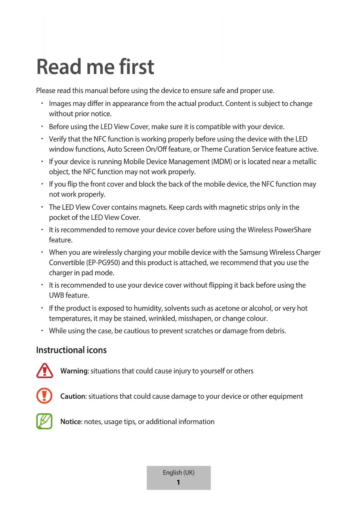 Accessories , and then use the LED icon editor feature. You can also use the LED icon editor app that appears when you attach the LED View Cover to the mobile device. English (UK) 6Copyright Copyright © 2020 Samsung Electronics Co., Ltd. This manual is protected under international copyright laws. No part of this manual may be reproduced, distributed, translated, or transmitted in any form or by any means, electronic or mechanical, including photocopying, recording, or storing in any information storage and retrieval system. Trademarks