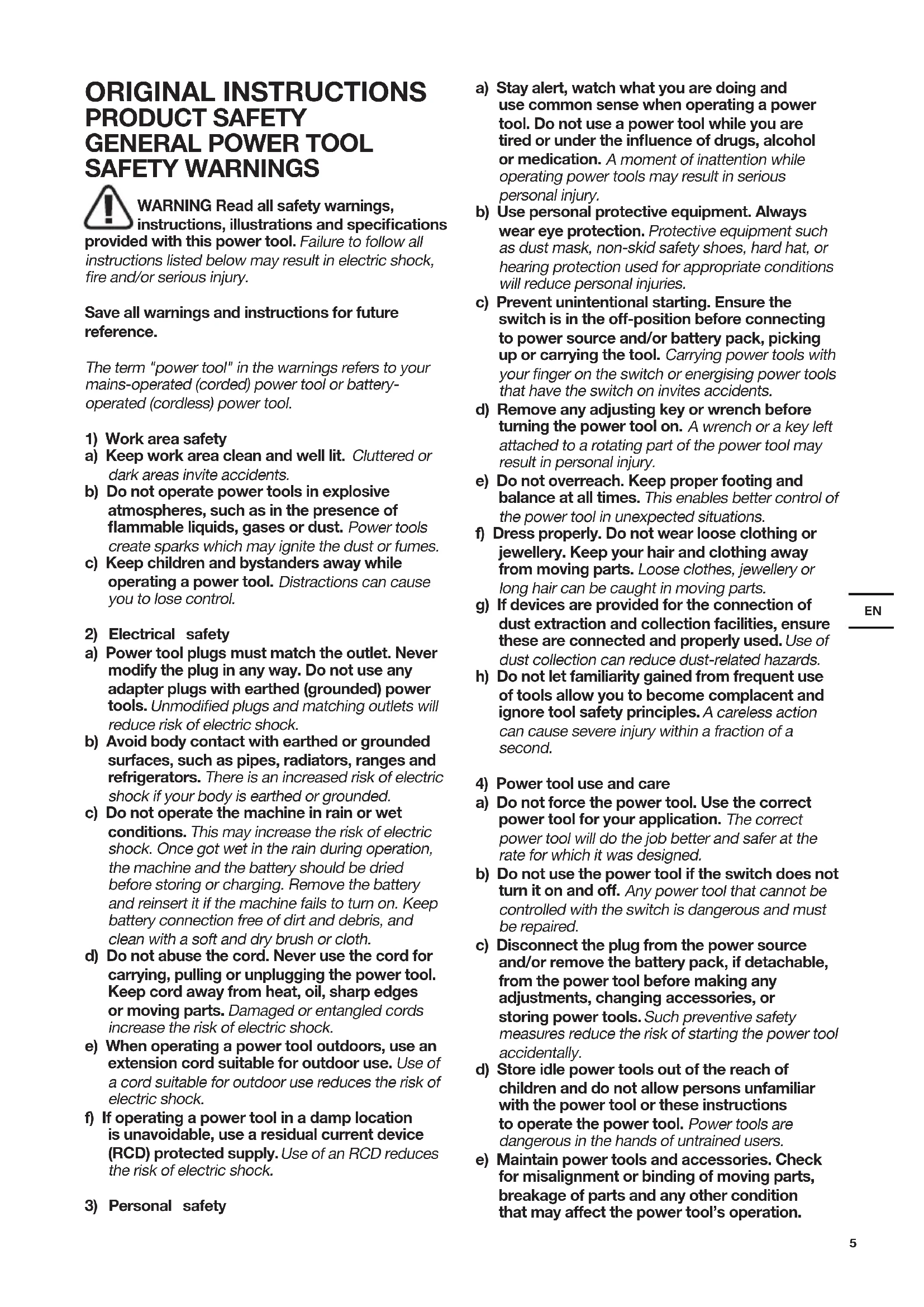 a) Do not force the power tool. Use the correct power tool for your application. The correct power tool will do the job better and safer at the rate for which it was designed. b) Do not use the power tool if the switch does not turn it on and off. Any power tool that cannot be controlled with the switch is dangerous and must be repaired. c) Disconnect the plug from the power source and/or remove the battery pack, if detachable, from the power tool before making any adjustments, changing accessories, or storing power tools. Such preventive safety measures reduce the risk of starting the power tool accidentally. d) Store idle power tools out of the reach of children and do not allow persons unfamiliar with the power tool or these instructions to operate the power tool. Power tools are dangerous in the hands of untrained users. e) Maintain power tools and accessories. Check for misalignment or binding of moving parts, breakage of parts and any other condition that may affect the power tool’s operation.6