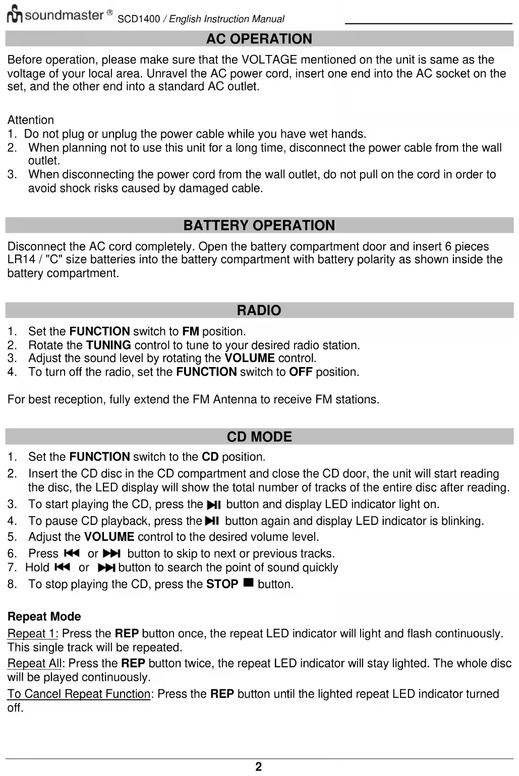 Repeat Mode Repeat 1: Press the REP button once, the repeat LED indicator will light and flash continuously. This single track will be repeated. Repeat All: Press the REP button twice, the repeat LED indicator will stay lighted. The whole disc will be played continuously. To Cancel Repeat Function: Press the REP button until the lighted repeat LED indicator turned off.SCD1400 / English Instruction Manual