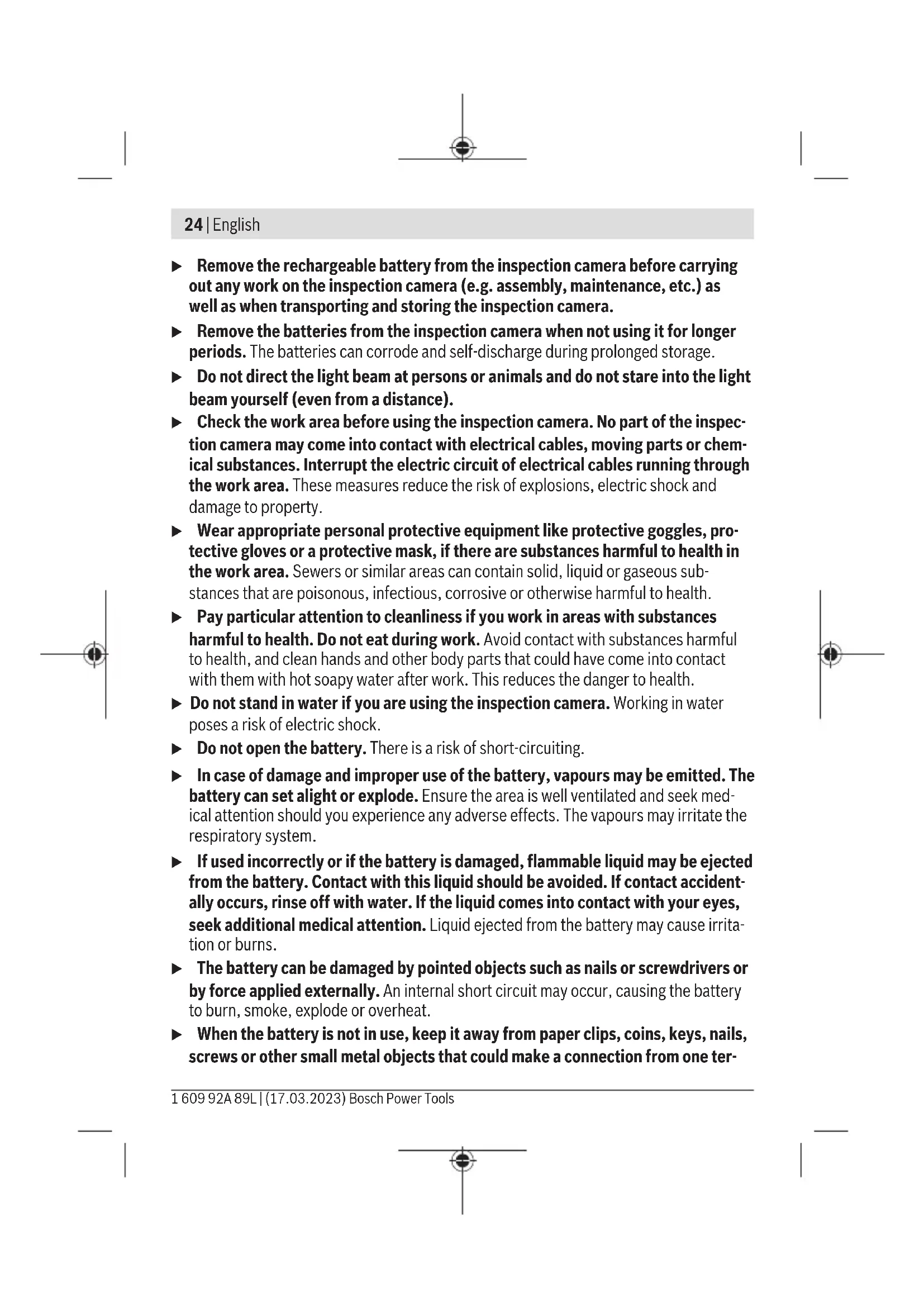 lx 200 Max. immersion time for camera head/cable in diesel, engine oil, ethyl alcohol, petrol, AdBlue® or salt water (26.5% salt content) min 30 Power supply Bosch Power Tools 1 609 92A 89L | (17.03.2023)28 | English Digital inspection camera GIC 12V-5-27 C – Rechargeable battery (Li-ion) 10.8V/12V – Non-rechargeable batteries (alkaline manganese, with battery adapter) 4×1.5VLR6(AA) – Rechargeable batteries (NiMH, with battery ad- apter) 4×1.2V HR6(AA) Backup power supply for saving the time – Coin cell CR2450 (3V, lithium battery) – Battery life approx. Years 3 Operating time, approx.