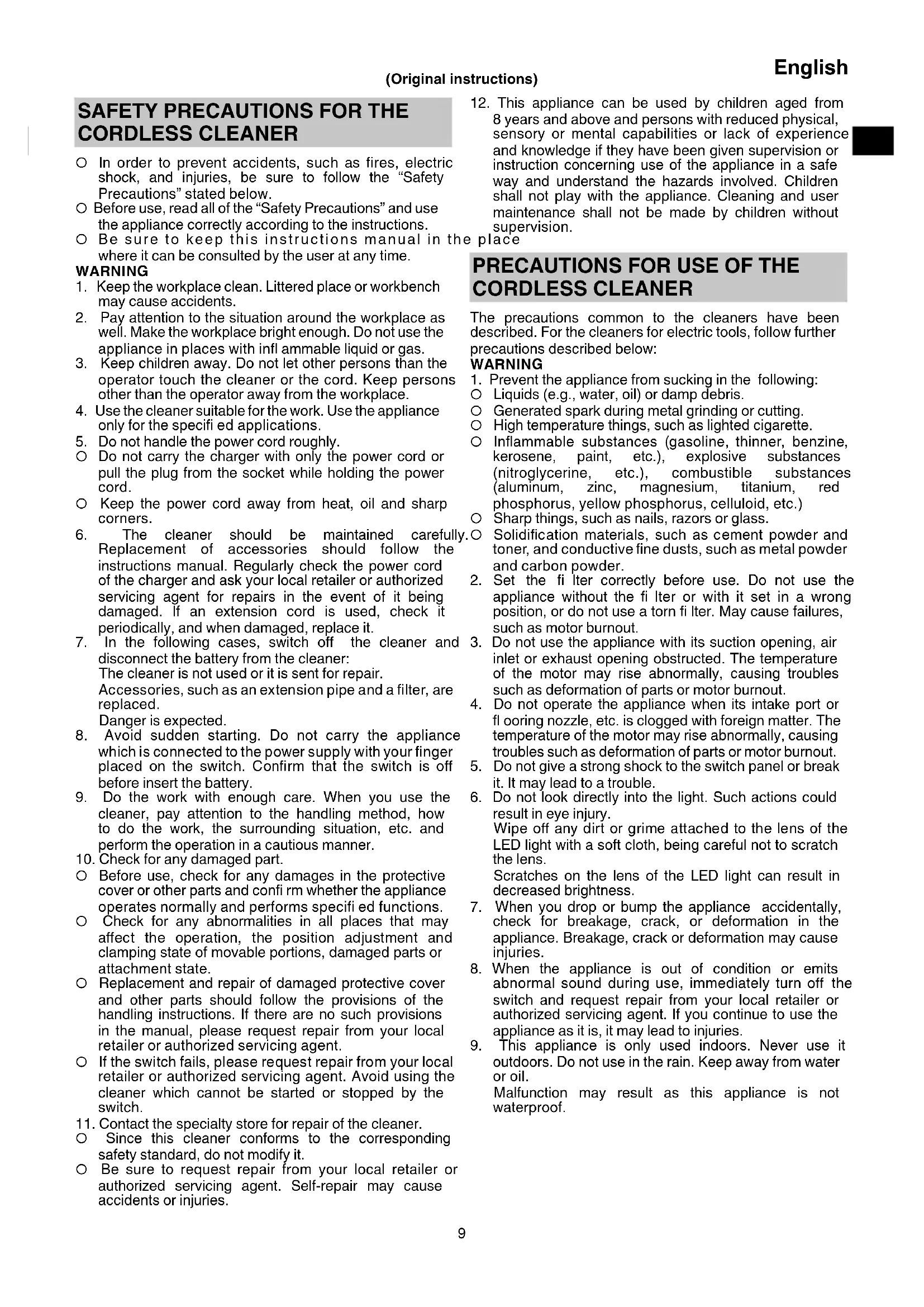 CORDLESS CLEANER The precautions common to the cleaners have been described. For the cleaners for electric tools, follow further precautions described below: WARNING