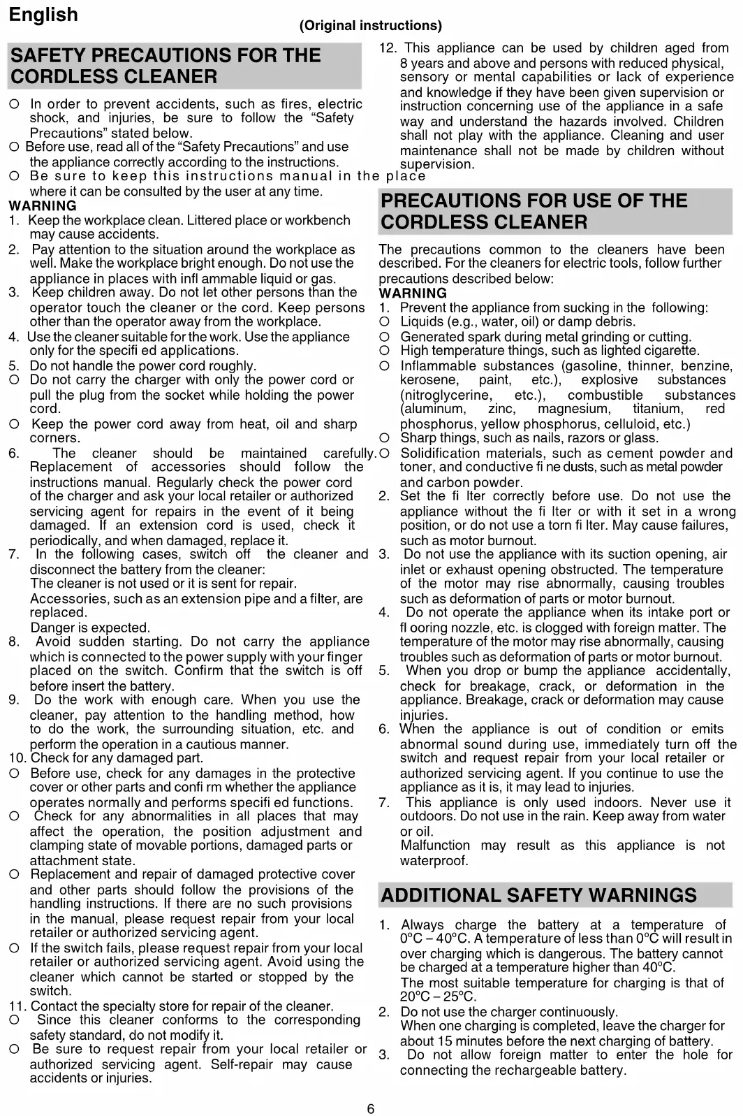 CORDLESS CLEANER The precautions common to the cleaners have been described. For the cleaners for electric tools, follow further precautions described below: WARNING