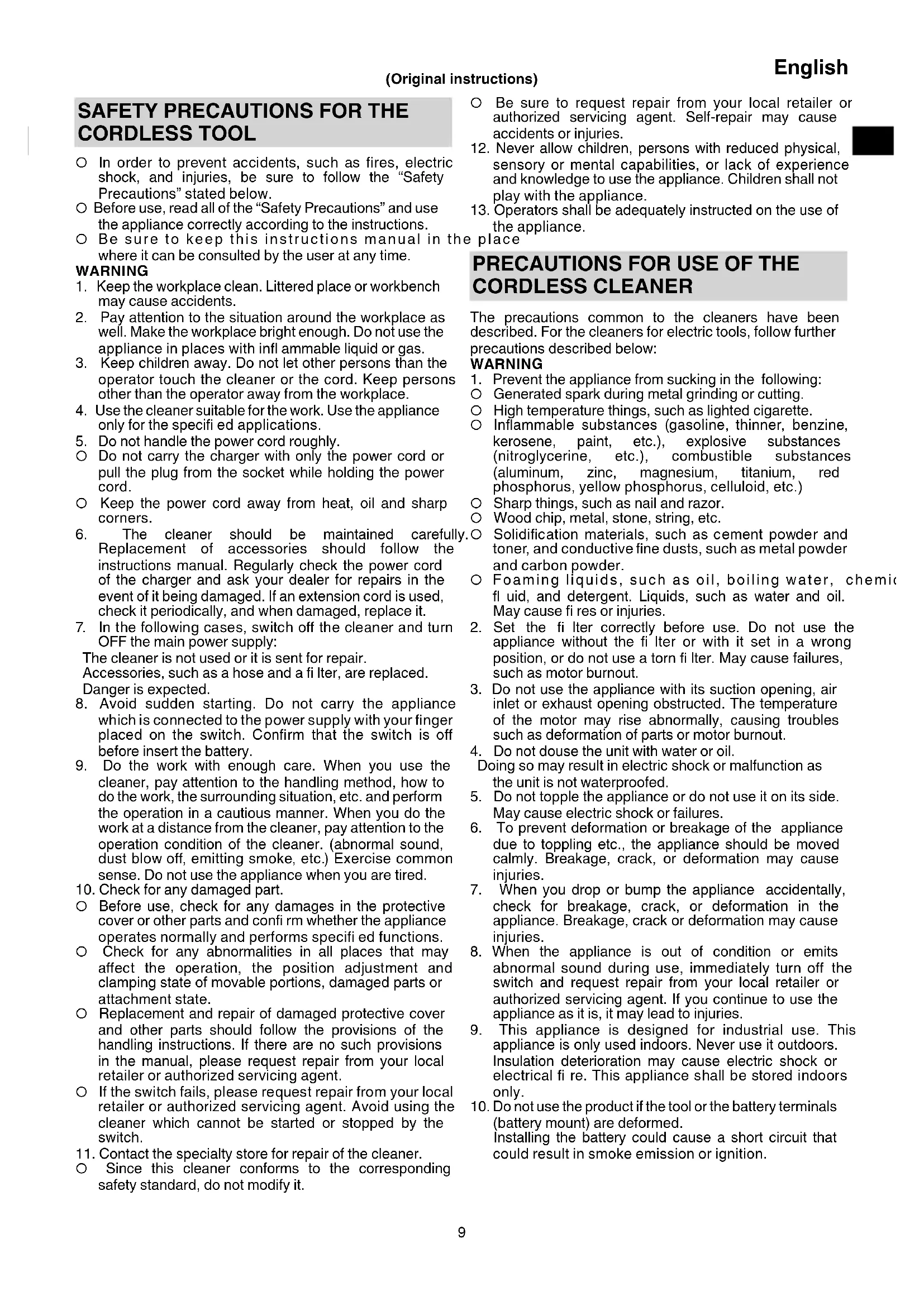 CORDLESS CLEANER The precautions common to the cleaners have been described. For the cleaners for electric tools, follow further precautions described below: WARNING