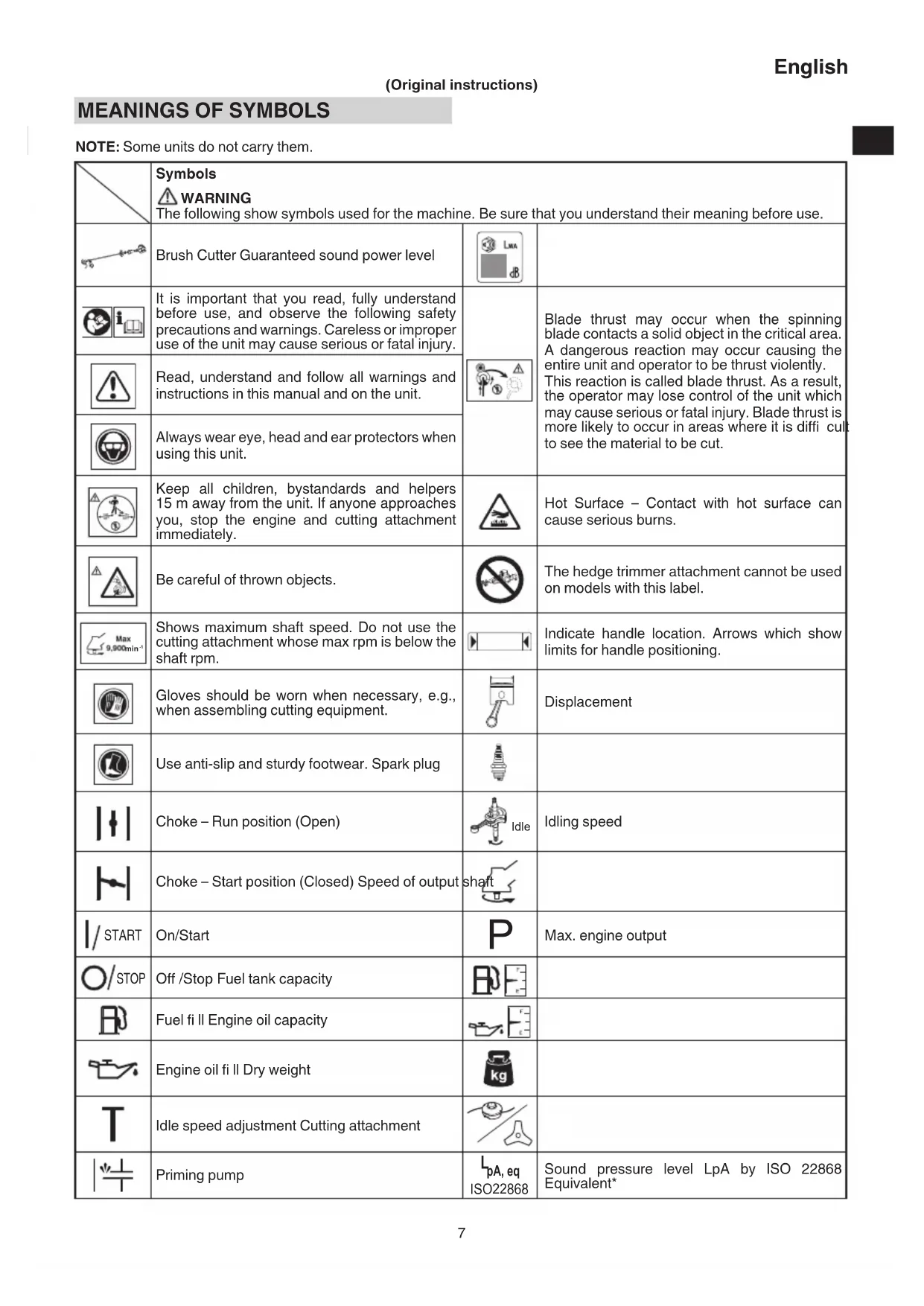 NOTE: Some units do not carry them. Symbols WARNING The following show symbols used for the machine. Be sure that you understand their meaning before use. Brush Cutter Guaranteed sound power level It is important that you read, fully understand before use, and observe the following safety precautions and warnings. Careless or improper use of the unit may cause serious or fatal injury. Blade thrust may occur when the spinning blade contacts a solid object in the critical area. A dangerous reaction may occur causing the entire unit and operator to be thrust violently. This reaction is called blade thrust. As a result, the operator may lose control of the unit which may cause serious or fatal injury. Blade thrust is more likely to occur in areas where it is diffi cult to see the material to be cut. Read, understand and follow all warnings and instructions in this manual and on the unit. Always wear eye, head and ear protectors when using this unit. Keep all children, bystandards and helpers 15 m away from the unit. If anyone approaches you, stop the engine and cutting attachment immediately. Hot Surface – Contact with hot surface can cause serious burns. Be careful of thrown objects. The hedge trimmer attachment cannot be used on models with this label. min