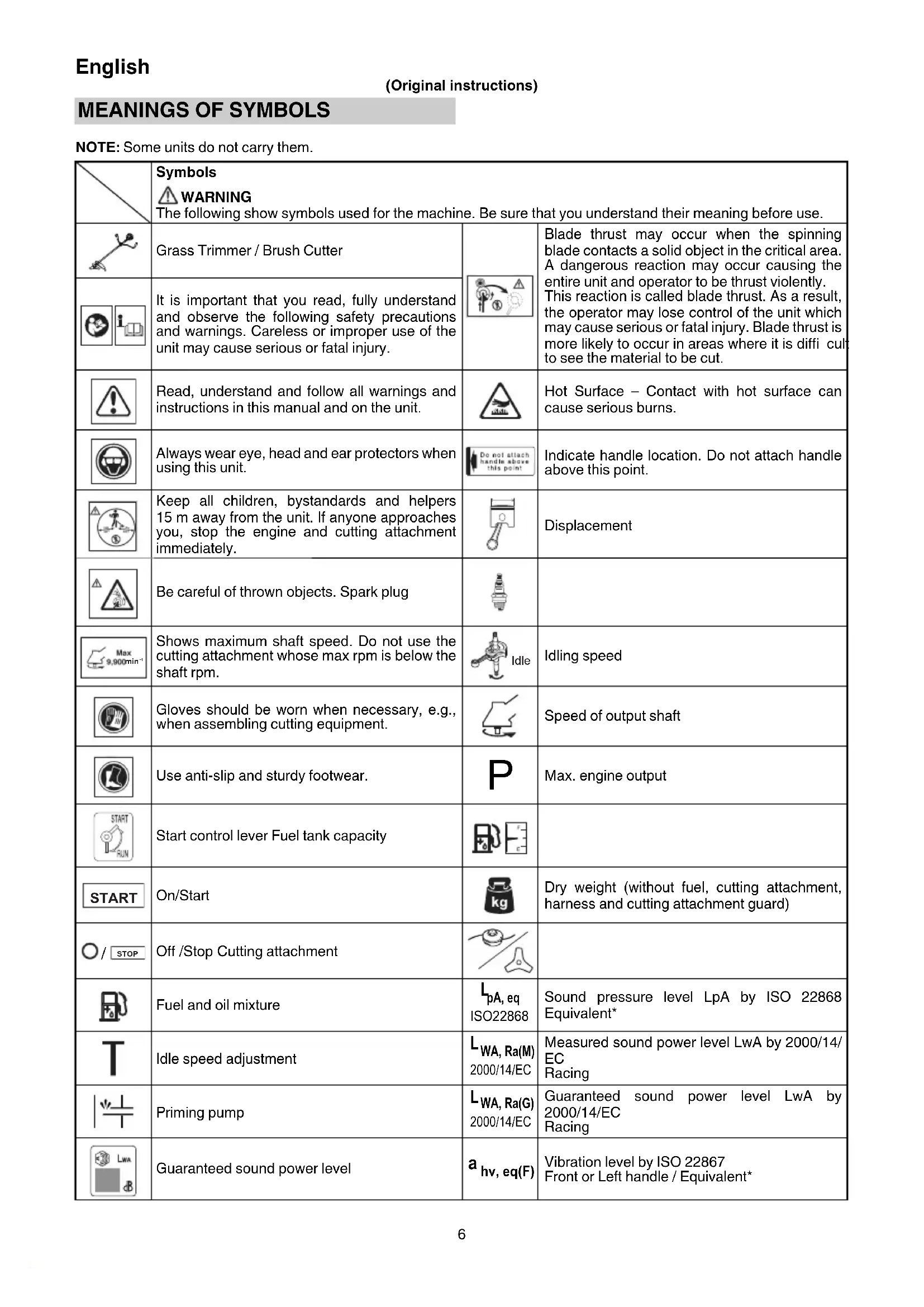 NOTE: Some units do not carry them. Symbols WARNING The following show symbols used for the machine. Be sure that you understand their meaning before use. Grass Trimmer / Brush Cutter Blade thrust may occur when the spinning blade contacts a solid object in the critical area. A dangerous reaction may occur causing the entire unit and operator to be thrust violently. This reaction is called blade thrust. As a result, the operator may lose control of the unit which may cause serious or fatal injury. Blade thrust is more likely to occur in areas where it is diffi cult to see the material to be cut. It is important that you read, fully understand and observe the following safety precautions and warnings. Careless or improper use of the unit may cause serious or fatal injury. Read, understand and follow all warnings and instructions in this manual and on the unit. Hot Surface – Contact with hot surface can cause serious burns. Always wear eye, head and ear protectors when using this unit. Indicate handle location. Do not attach handle above this point. Keep all children, bystandards and helpers 15 m away from the unit. If anyone approaches you, stop the engine and cutting attachment immediately. Displacement Be careful of thrown objects. Spark plug min