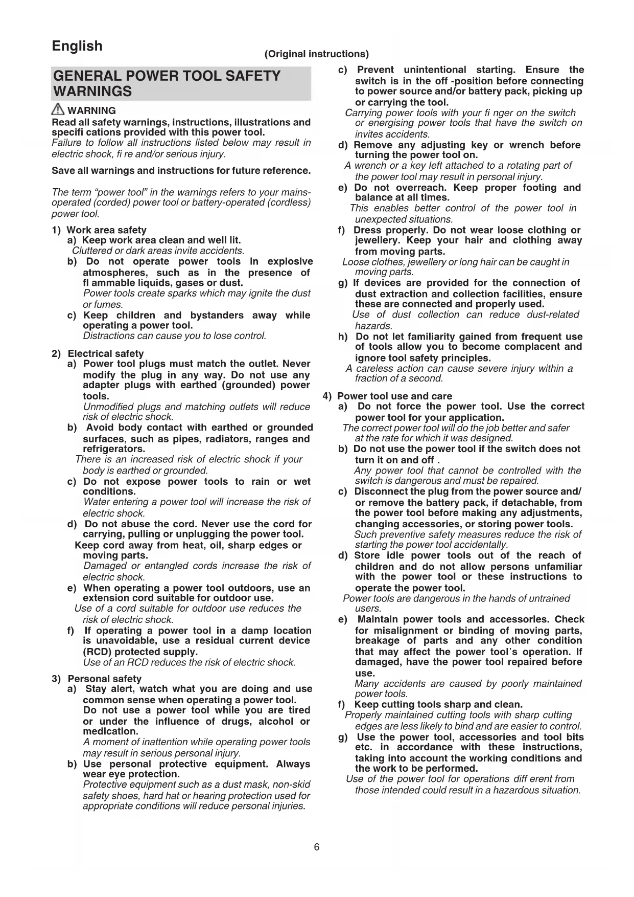 a) Do not force the power tool. Use the correct power tool for your application. The correct power tool will do the job better and safer at the rate for which it was designed. b) Do not use the power tool if the switch does not turn it on and off . Any power tool that cannot be controlled with the switch is dangerous and must be repaired. c) Disconnect the plug from the power source and/ or remove the battery pack, if detachable, from the power tool before making any adjustments, changing accessories, or storing power tools. Such preventive safety measures reduce the risk of starting the power tool accidentally. d) Store idle power tools out of the reach of children and do not allow persons unfamiliar with the power tool or these instructions to operate the power tool. Power tools are dangerous in the hands of untrained users. e) Maintain power tools and accessories. Check for misalignment or binding of moving parts, breakage of parts and any other condition that may aff ect the power toolʼs operation. If damaged, have the power tool repaired before use. Many accidents are caused by poorly maintained power tools. f) Keep cutting tools sharp and clean. Properly maintained cutting tools with sharp cutting edges are less likely to bind and are easier to control. g) Use the power tool, accessories and tool bits etc. in accordance with these instructions, taking into account the working conditions and the work to be performed. Use of the power tool for operations diff erent from those intended could result in a hazardous situation.