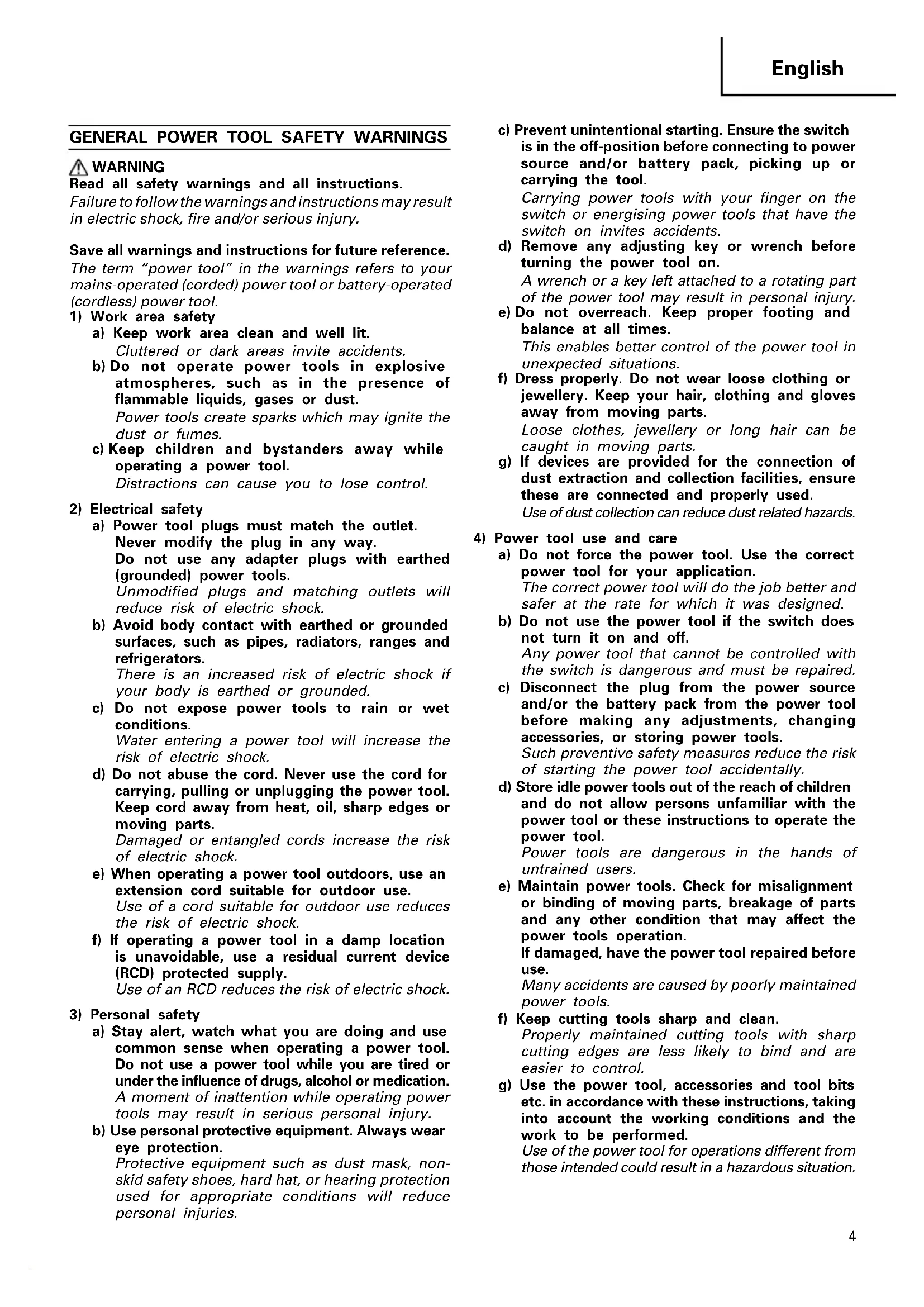 a) Do not force the power tool. Use the correct power tool for your application. The correct power tool will do the job better and safer at the rate for which it was designed. b) Do not use the power tool if the switch does not turn it on and off. Any power tool that cannot be controlled with the switch is dangerous and must be repaired. c) Disconnect the plug from the power source and/or the battery pack from the power tool before making any adjustments, changing accessories, or storing power tools. Such preventive safety measures reduce the risk of starting the power tool accidentally. d) Store idle power tools out of the reach of children and do not allow persons unfamiliar with the power tool or these instructions to operate the power tool. Power tools are dangerous in the hands of untrained users. e) Maintain power tools. Check for misalignment or binding of moving parts, breakage of parts and any other condition that may affect the power tools operation. If damaged, have the power tool repaired before use. Many accidents are caused by poorly maintained power tools. f) Keep cutting tools sharp and clean. Properly maintained cutting tools with sharp cutting edges are less likely to bind and are easier to control. g) Use the power tool, accessories and tool bits etc. in accordance with these instructions, taking into account the working conditions and the work to be performed. Use of the power tool for operations different from those intended could result in a hazardous situation. 01Eng_RB14DSL_WE 08/3/27, 19:2545 English