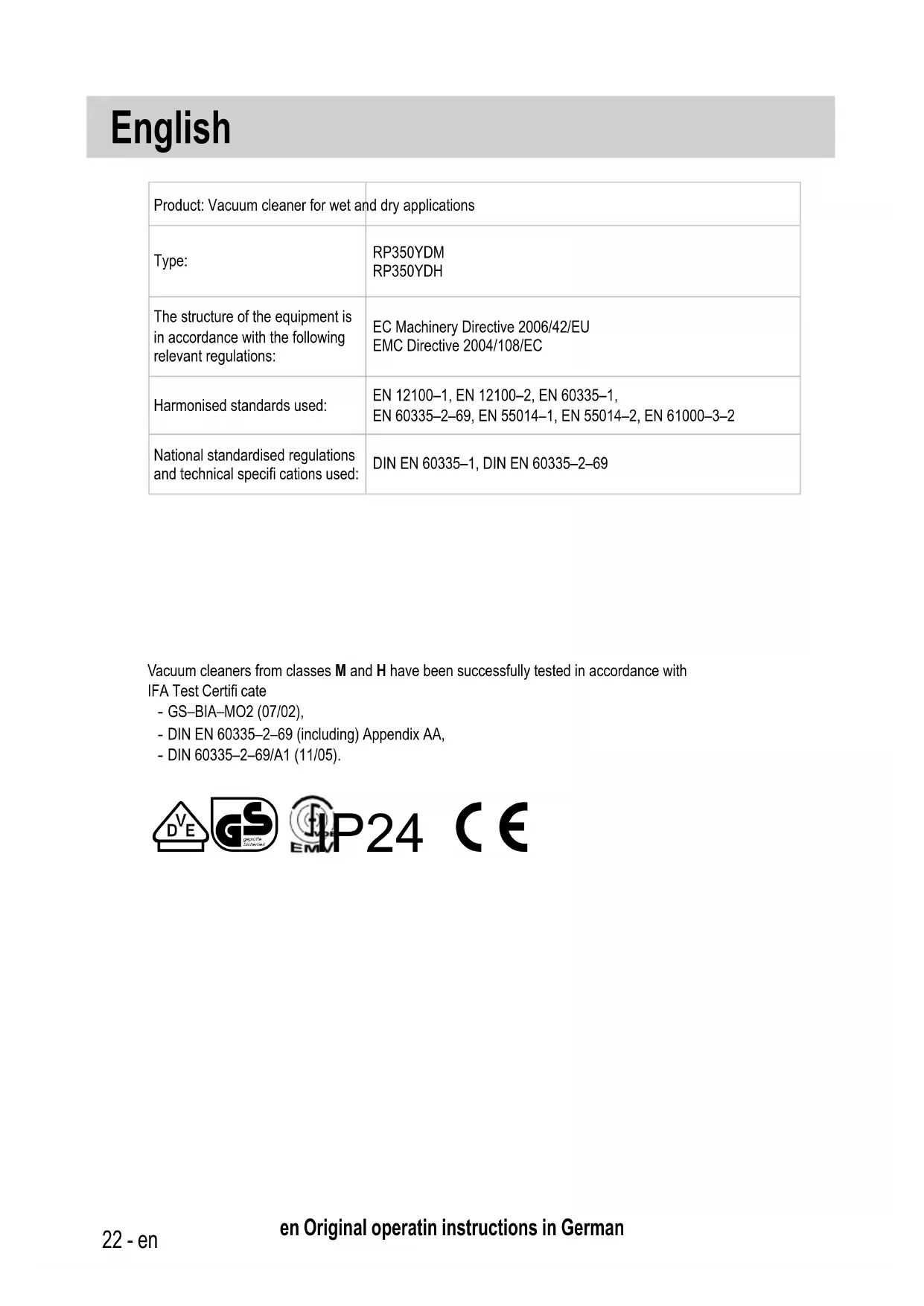 L DANGER! ▶Danger of suffocation ● Keep packaging material such as plastic bags away from children. ▶Never stand or sit upon the vacuum device. ▶Particular caution is advised when ascending stairs. Pay attention to standing safely. ▶Do not pull the suction hose and connection line over sharp edges, kink it or shut it. ▶Always lay the suction hose and connection line so that nobody may trip over them. ▶In case of any leakage of foam or liquid, immediately switch off the vacuum device. ▶Always keep dry the inside of the lid. ▶Do not start the vacuum device including its accessories if: ● the vacuum device shows detectable damage (fi ssures/cracks); ● the power connection line is defective or shows fi ssuring or ageing; or ● any invisible defect is suspected (after a fall). ▶Do not allow the rotating brushes to get into contact with the power connection line. l DANGER! ▶Do not operate the vacuum device where there is danger of explosions. ▶Keep away the vacuum device from infl ammable gases and substances. l DANGER! ▶Do not aspirate any combustible or explosive solvents, materials soaked in sol- vents, explosive dusts, liquids such as petrol, oil, alcohol, diluents or materials hotter then 60 °C (140 °F). ▷Otherwise there will be danger of fi re and explosions! l DANGER! ▶Have repairs been made only by experts, e. g. the producer’s service. Use original spare parts only. ▶Improperly repaired devices pose a hazard for the user. 000BookRP350YDM.indb23000BookRP350YDM.indb23 2019/10/267:30:382019/10/267:30:3824 - en l DANGER! ▶Use the socket of the vacuum device only for the purposes defi ned in the instruction manual. ▶In case of any inappropriate usage, improper operation or repair, the producer shall be exempt from liability. ▶Do not use any damaged extension lines. ▶If the connector line of the vacuum device has been damaged, it must be repla- ced with a special connector line which is available from the producer or their service. ▶Electric brushes: Do not allow the rotating brushes to get into contact with the power connection line. ▶The voltage on the type sign must correspond to the grid voltage. ▶After every use and before any maintenance, switch off the vacuum device and pull the power plug. ▶Pull on the plug only, not on the line. ▶Never plug or pull the power plug with wet hands. ▶The socket must be secured via a household fuse with a suitable current rating. ▶Never open the vacuum device outdoors in rain or storm. l WARNING! ▶Class M vacuum devices are suitable for aspiration/clearing of dry, non-com- bustible dusts, non-combustible liquids, wood dusts and hazardous dusts with workplace limit values of ≥ 0.1 mg/m³. ▶Class H vacuum devices are suitable for aspiration/clearing of dry, non-com- bustible dusts, carcinogenic and pathogenic particles as well as non-combus- tible liquids, wood dusts and toxic dusts with all occupational exposure limit values. ▶Vacuum cleaner for dust class L suitable for up/exhausting of dry, non-fl ammable, hazardous dust with occupational exposure limit values (AGWS)> 1 mg/m³. 000BookRP350YDM.indb24000BookRP350YDM.indb24 2019/10/267:30:382019/10/267:30:38en - 25
