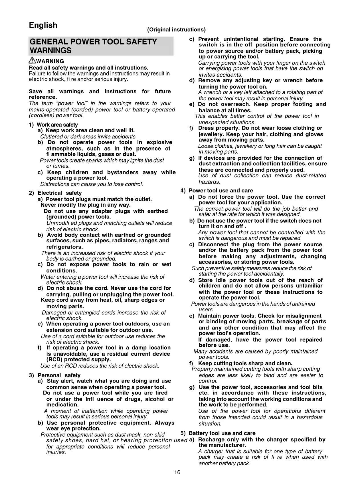 a) Stay alert, watch what you are doing and use common sense when operating a power tool. Do not use a power tool while you are tired or under the infl uence of drugs, alcohol or medication. A moment of inattention while operating power tools may result in serious personal injury. b) Use personal protective equipment. Always wear eye protection. Protective equipment such as dust mask, non-skid safety shoes, hard hat, or hearing protection used for appropriate conditions will reduce personal injuries. c) Prevent unintentional starting. Ensure the switch is in the off position before connecting to power source and/or battery pack, picking up or carrying the tool. Carrying power tools with your fi nger on the switch or energising power tools that have the switch on invites accidents. d) Remove any adjusting key or wrench before turning the power tool on. A wrench or a key left attached to a rotating part of the power tool may result in personal injury. e) Do not overreach. Keep proper footing and balance at all times. This enables better control of the power tool in unexpected situations. f) Dress properly. Do not wear loose clothing or jewellery. Keep your hair, clothing and gloves away from moving parts. Loose clothes, jewellery or long hair can be caught in moving parts. g) If devices are provided for the connection of dust extraction and collection facilities, ensure these are connected and properly used. Use of dust collection can reduce dust-related hazards.
