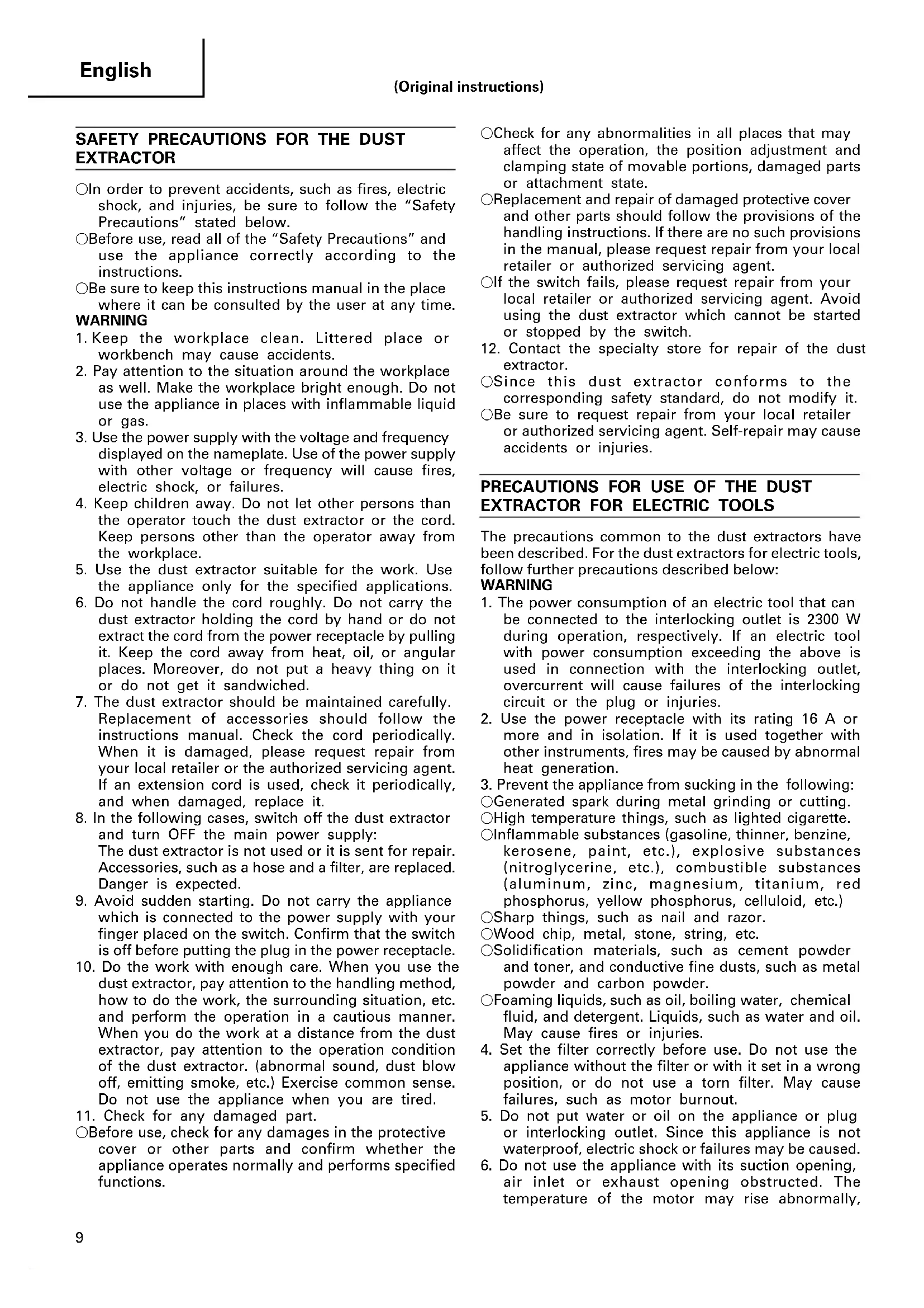 The precautions common to the dust extractors have been described. For the dust extractors for electric tools, follow further precautions described below: WARNING