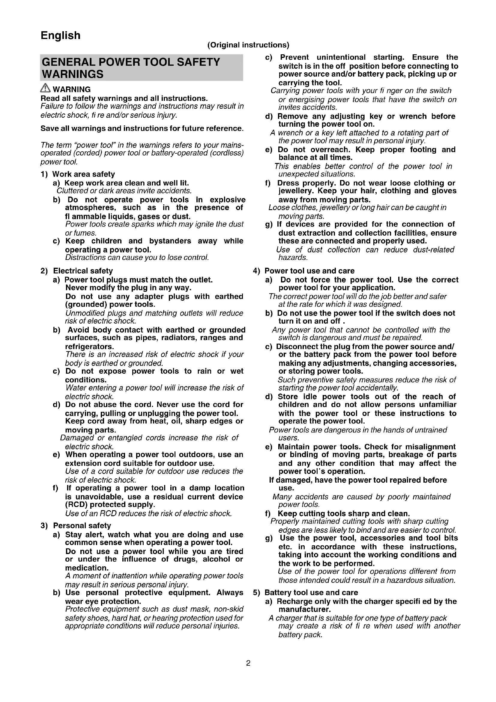 a) Stay alert, watch what you are doing and use common sense when operating a power tool. Do not use a power tool while you are tired or under the infl uence of drugs, alcohol or medication. A moment of inattention while operating power tools may result in serious personal injury. b) Use personal protective equipment. Always wear eye protection. Protective equipment such as dust mask, non-skid safety shoes, hard hat, or hearing protection used for appropriate conditions will reduce personal injuries. (Original instructions) 0000BookWH14DSDL.indb20000BookWH14DSDL.indb2 2018/05/2210:39:452018/05/2210:39:453 English b) Use power tools only with specifi cally designated battery packs. Use of any other battery packs may create a risk of injury and fi re. c) When battery pack is not in use, keep it away from other metal objects, like paper clips, coins, keys, nails, screws or other small metal objects, that can make a connection from one terminal to another. Shorting the battery terminals together may cause burns or a fi re. d) Under abusive conditions, liquid may be ejected from the battery; avoid contact. If contact accidentally occurs, fl ush with water. If liquid contacts eyes, additionally seek medical help. Liquid ejected from the battery may cause irritation or burns.