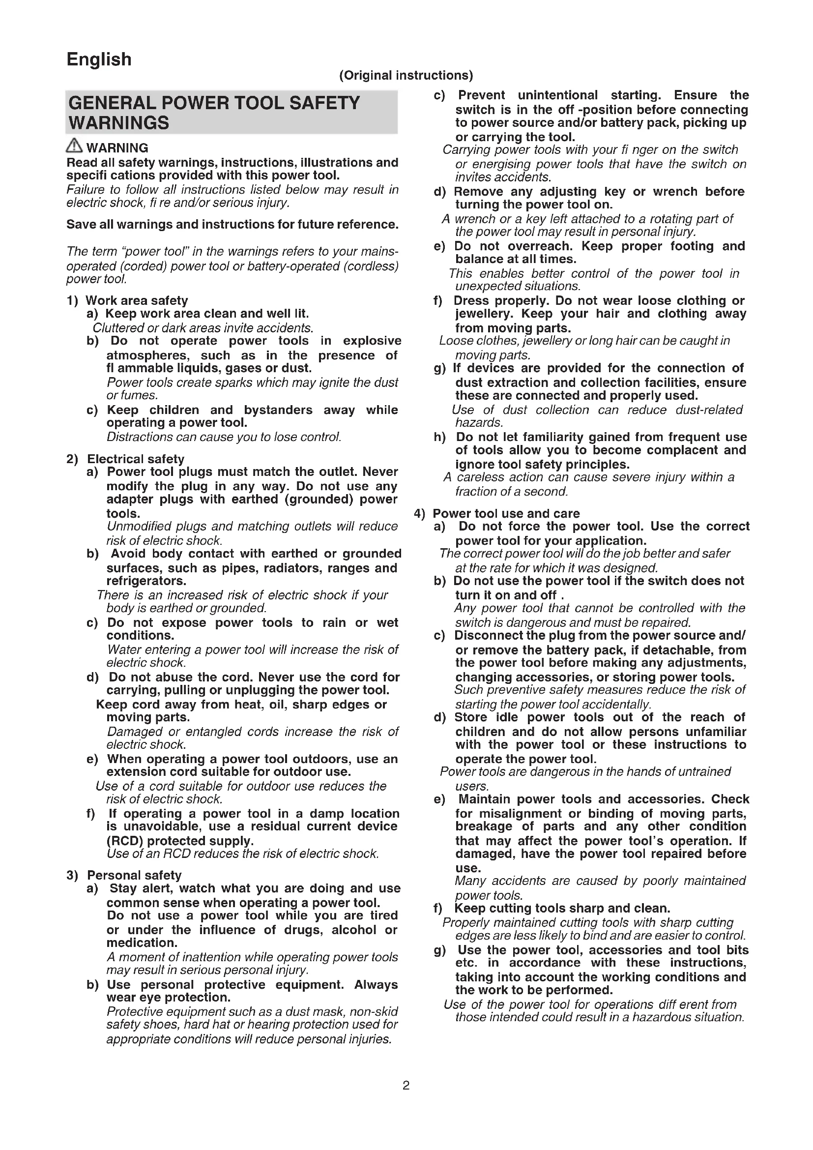 a) Do not force the power tool. Use the correct power tool for your application. The correct power tool will do the job better and safer at the rate for which it was designed. b) Do not use the power tool if the switch does not turn it on and off . Any power tool that cannot be controlled with the switch is dangerous and must be repaired. c) Disconnect the plug from the power source and/ or remove the battery pack, if detachable, from the power tool before making any adjustments, changing accessories, or storing power tools. Such preventive safety measures reduce the risk of starting the power tool accidentally. d) Store idle power tools out of the reach of children and do not allow persons unfamiliar with the power tool or these instructions to operate the power tool. Power tools are dangerous in the hands of untrained users. e) Maintain power tools and accessories. Check for misalignment or binding of moving parts, breakage of parts and any other condition that may aff ect the power toolʼs operation. If damaged, have the power tool repaired before use. Many accidents are caused by poorly maintained power tools. f) Keep cutting tools sharp and clean. Properly maintained cutting tools with sharp cutting edges are less likely to bind and are easier to control. g) Use the power tool, accessories and tool bits etc. in accordance with these instructions, taking into account the working conditions and the work to be performed. Use of the power tool for operations diff erent from those intended could result in a hazardous situation.