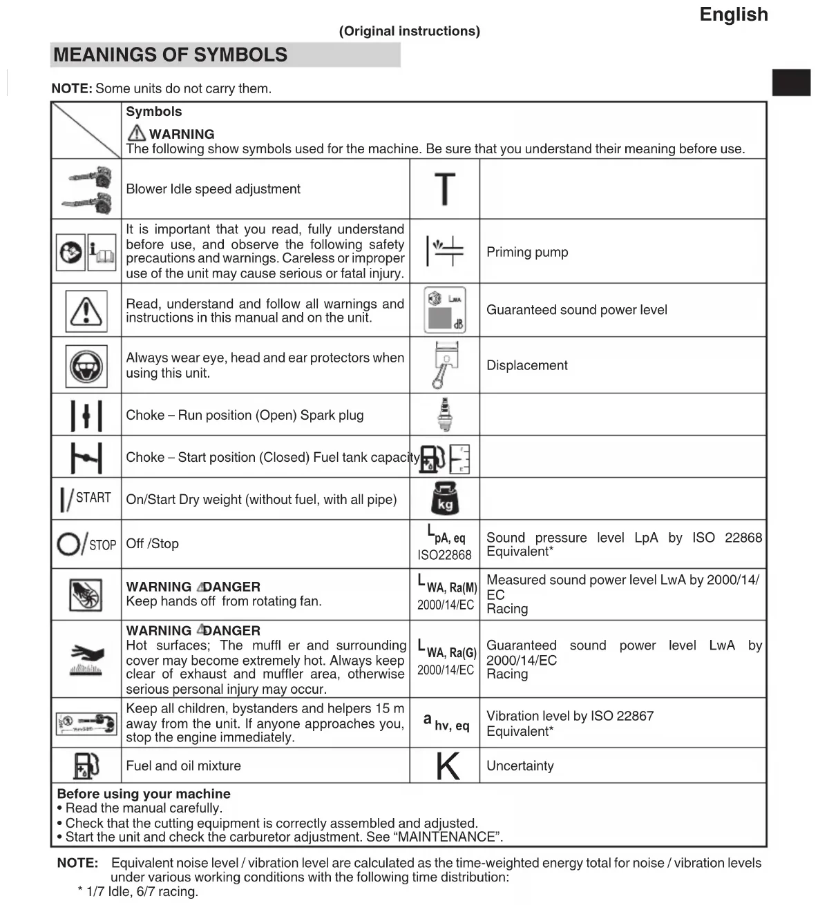 NOTE: Some units do not carry them. Symbols WARNING The following show symbols used for the machine. Be sure that you understand their meaning before use. Blower Idle speed adjustment It is important that you read, fully understand before use, and observe the following safety precautions and warnings. Careless or improper use of the unit may cause serious or fatal injury. Priming pump Read, understand and follow all warnings and instructions in this manual and on the unit. Guaranteed sound power level Always wear eye, head and ear protectors when using this unit. Displacement Choke – Run position (Open) Spark plug Choke – Start position (Closed) Fuel tank capacity START On/Start Dry weight (without fuel, with all pipe) STOP Off /Stop