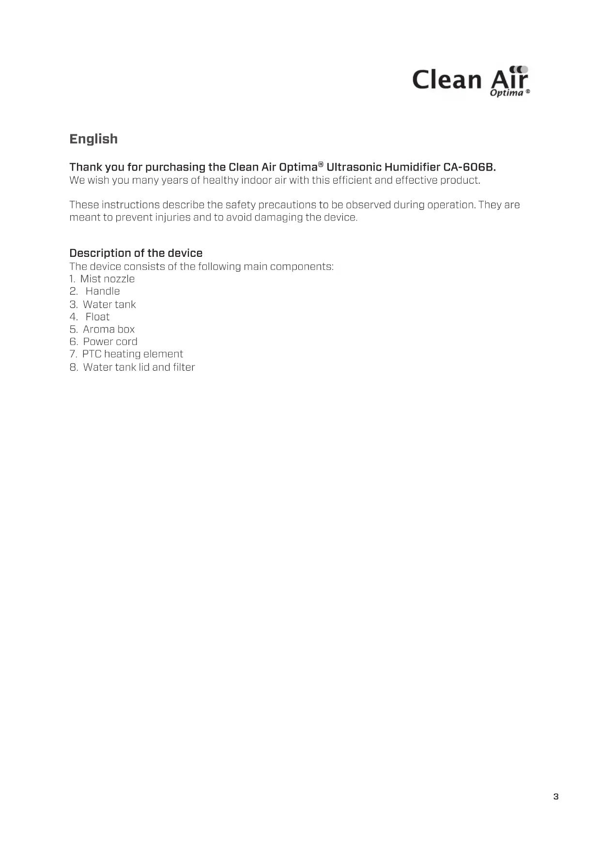 CA-606B / Display3 English Thank you for purchasing the Clean Air Optima® Ultrasonic Humidifier CA-606B. We wish you many years of healthy indoor air with this ecient and eective product. These instructions describe the safety precautions to be observed during operation. They are meant to prevent injuries and to avoid damaging the device. Description of the device The device consists of the following main components: