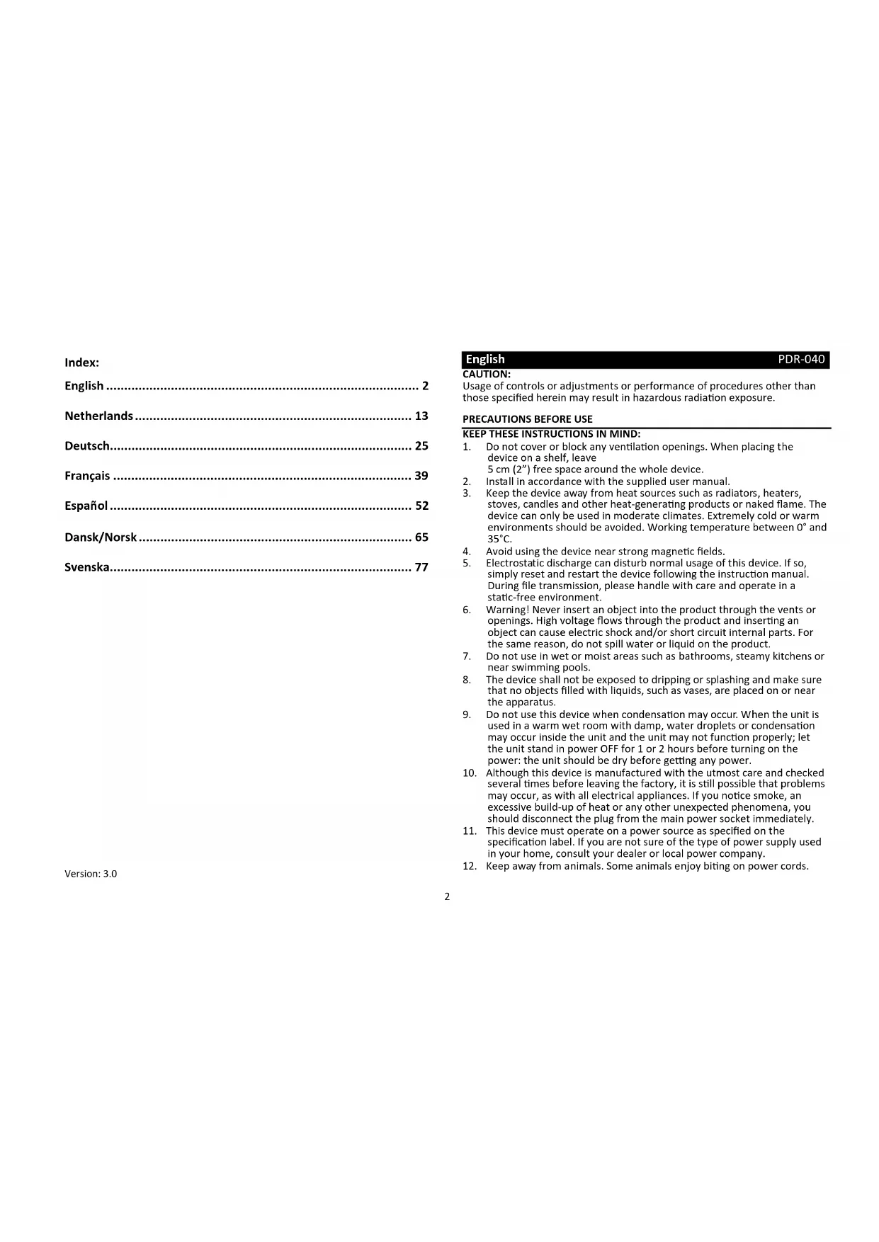 Version: 3.0 English PDR-040 CAUTION: Usage of controls or adjustments or performance of procedures other than those specified herein may result in hazardous radiation exposure.