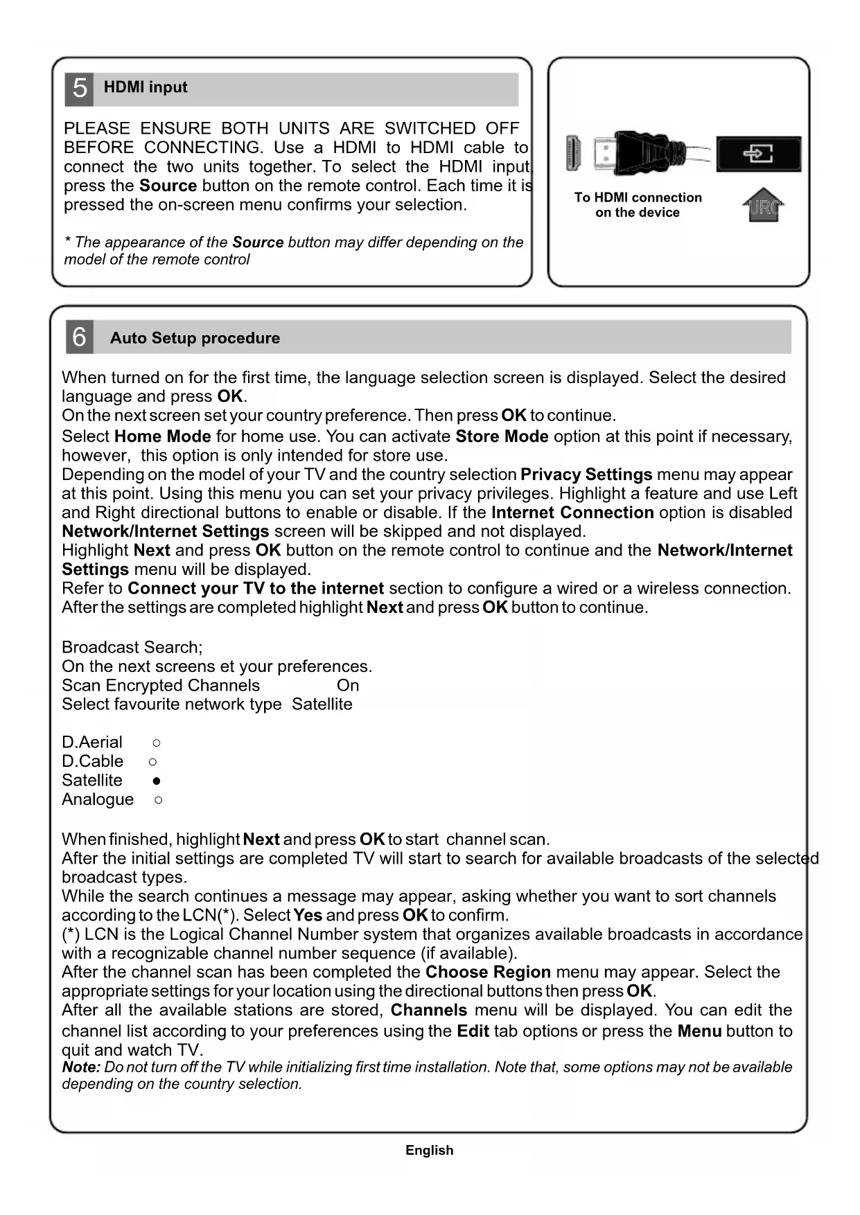 SOURCESOURCE To HDMI connecton on the devce After all the available stations are stored, Channels menu will be displayed. You can edit the channel list according to your preferences using the Edit tab options or press the Menu button to quit and watch TV. When finished, highlight Next and press OK to start channel scan. After the channel scan has been completed the Choose Region menu may appear. Select the appropriate settings for your location using the directional buttons then press OK. Analogue ○ While the search continues a message may appear, asking whether you want to sort channels according to the LCN(*). Select Yes and press OK to confirm. Note: Do not turn off the TV while initializing first time installation. Note that, some options may not be available depending on the country selection. After the initial settings are completed TV will start to search for available broadcasts of the selected broadcast types. (*) LCN is the Logical Channel Number system that organizes available broadcasts in accordance with a recognizable channel number sequence (if available). Broadcast Search; Scan Encrypted Channels On Select favourite network type Satellte On the next screens et your preferences. D.Aerial ○ D.Cable ○ Satellite ● Select Home Mode for home use. You can activate Store Mode option at this point if necessary, however, this option is only intended for store use. Depending on the model of your TV and the country selection Privacy Settings menu may appear at this point. Using this menu you can set your privacy privileges. Highlight a feature and use Left and Right directional buttons to enable or disable. If the Internet Connection option is disabled Network/Internet Settings screen will be skipped and not displayed. Hghlght Next and press OK button on the remote control to continue and the Network/Internet Settings menu will be displayed. Refer to Connect your TV to the nternet secton to confgure a wred or a wreless connecton. After the settngs are completed hghlght Next and press OK button to contnue. When turned on for the first time, the language selection screen is displayed. Select the desired language and press OK. On the next screen set your country preference. Then press OK to continue.English Connect your TV to the Internet