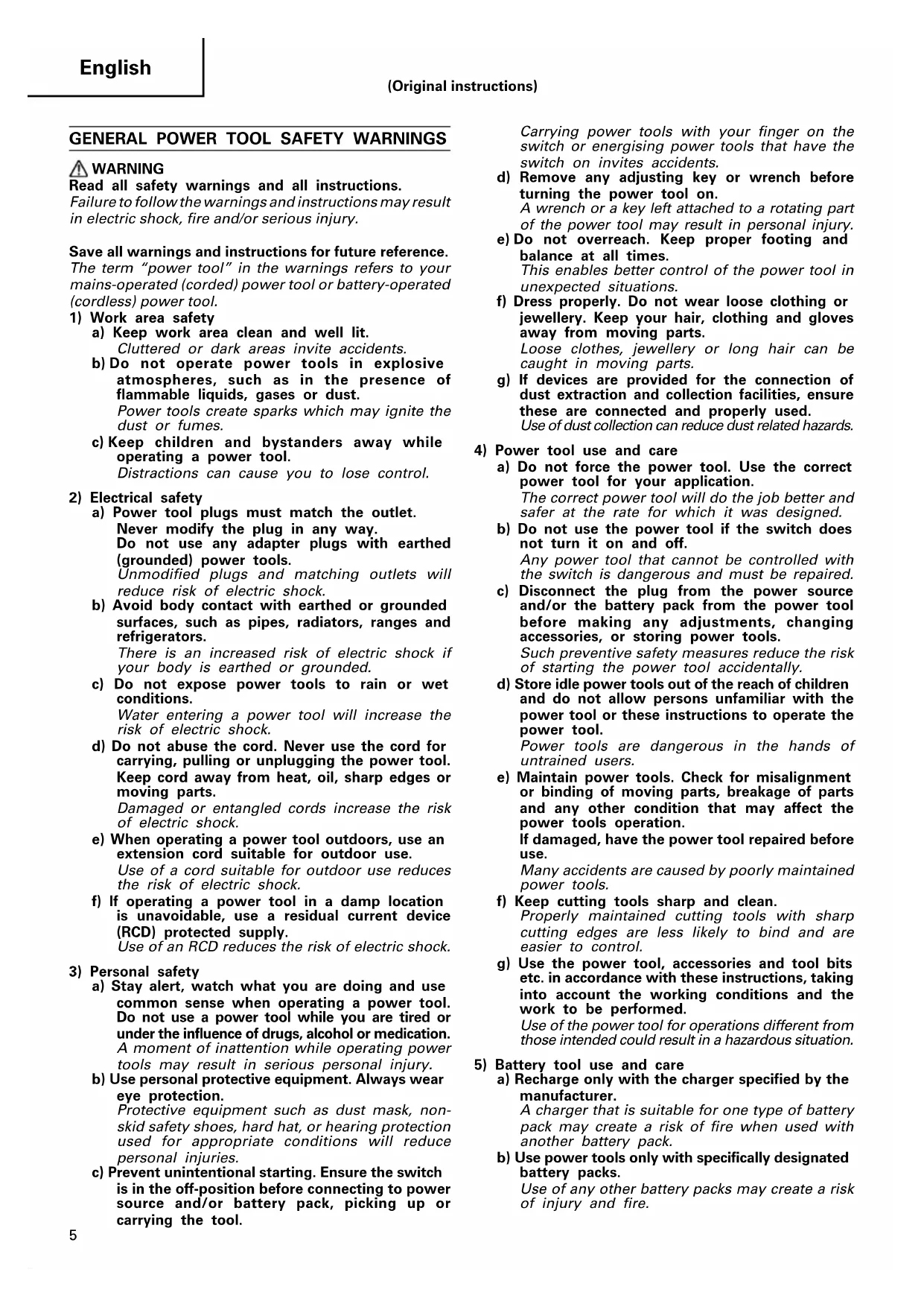 a) Recharge only with the charger specified by the manufacturer. A charger that is suitable for one type of battery pack may create a risk of fire when used with another battery pack. b) Use power tools only with specifically designated battery packs. Use of any other battery packs may create a risk of injury and fire. (Original instructions) 01Eng_WM10DBL_WE 12/2/11, 13:075English