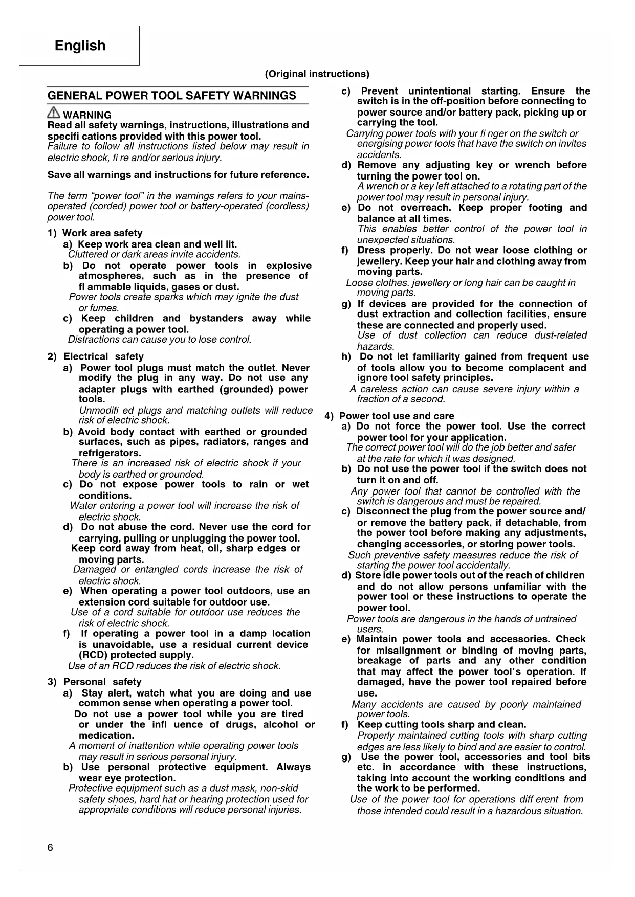 a) Stay alert, watch what you are doing and use common sense when operating a power tool. Do not use a power tool while you are tired or under the infl uence of drugs, alcohol or medication. A moment of inattention while operating power tools may result in serious personal injury. b) Use personal protective equipment. Always wear eye protection. Protective equipment such as a dust mask, non-skid safety shoes, hard hat or hearing protection used for appropriate conditions will reduce personal injuries. c) Prevent unintentional starting. Ensure the switch is in the off -position before connecting to power source and/or battery pack, picking up or carrying the tool. Carrying power tools with your fi nger on the switch or energising power tools that have the switch on invites accidents. d) Remove any adjusting key or wrench before turning the power tool on. A wrench or a key left attached to a rotating part of the power tool may result in personal injury. e) Do not overreach. Keep proper footing and balance at all times. This enables better control of the power tool in unexpected situations. f) Dress properly. Do not wear loose clothing or jewellery. Keep your hair and clothing away from moving parts. Loose clothes, jewellery or long hair can be caught in moving parts. g) If devices are provided for the connection of dust extraction and collection facilities, ensure these are connected and properly used. Use of dust collection can reduce dust-related hazards. h) Do not let familiarity gained from frequent use of tools allow you to become complacent and ignore tool safety principles. A careless action can cause severe injury within a fraction of a second.