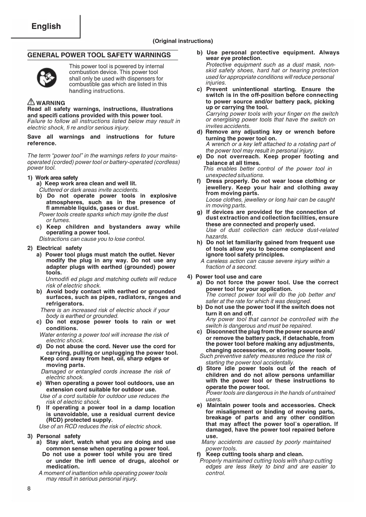 This power tool is powered by internal combustion device. This power tool shall only be used with dispensers for combustible gas which are listed in this handling instructions. WARNING Read all safety warnings, instructions, illustrations and specifi cations provided with this power tool. Failure to follow all instructions listed below may result in electric shock, fi re and/or serious injury. Save all warnings and instructions for future reference. The term “power tool” in the warnings refers to your mains- operated (corded) power tool or battery-operated (cordless) power tool.
