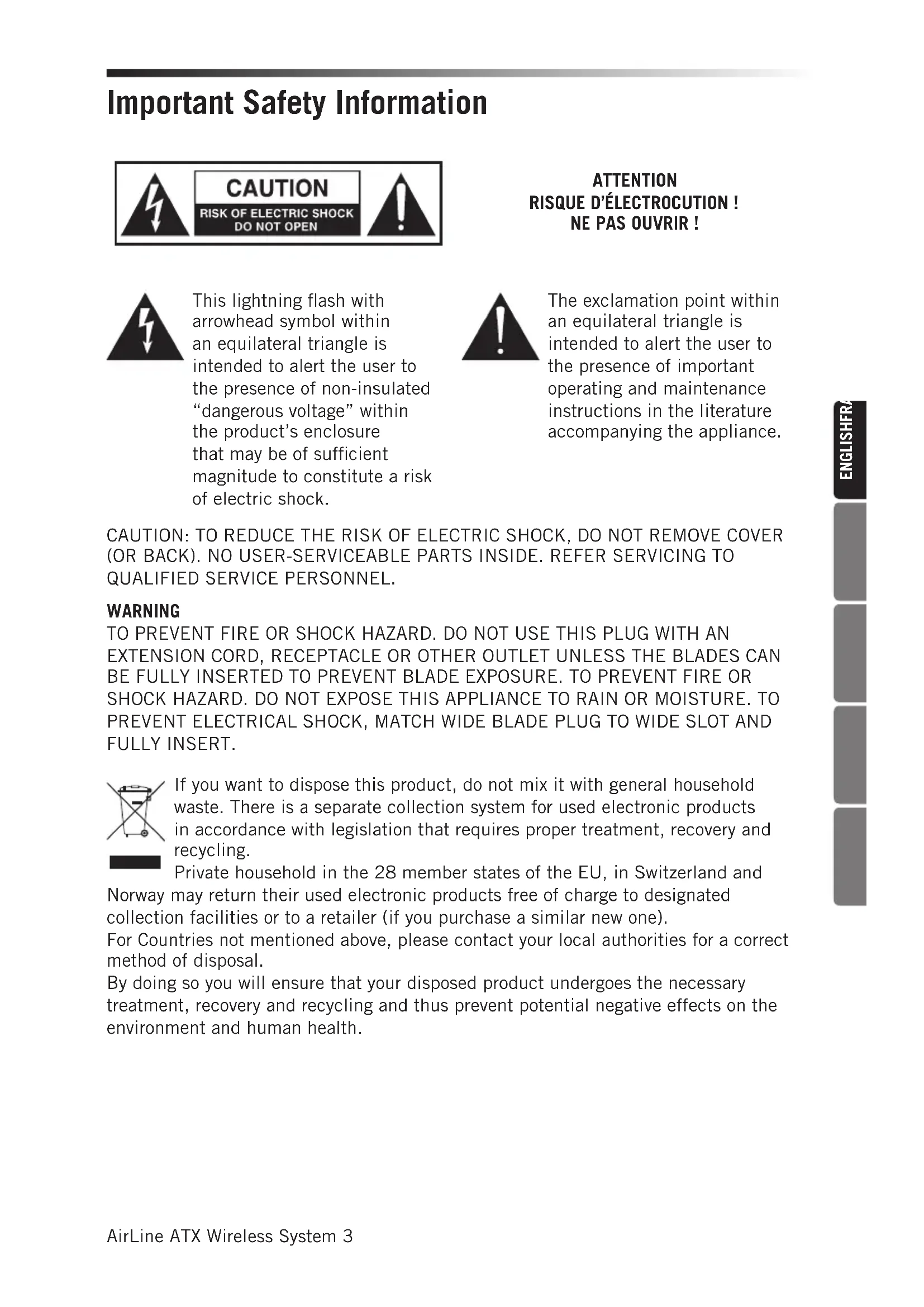 - The optimal temperature range for using and storing the battery is 50°F - 86°F (30°C - 50°C). The battery performance and operation may decrease in temperatures below 50°F (30°C). A warning that batteries (battery pack or batteries installed) shall not be exposed to excessive heat such as sunshine, fire or the like. CAUTION: Danger of explosion if battery is incorrectly replaced. Replace only with the same or equivalent type. Attention should be drawn to the environmental aspects of battery disposal10 Positioning the HM60 Wind Instrument Mic When positioning the HM60 wind instrument microphone, there are some general rules that you should follow. Always position the microphone as close to the sound source as possible. This is easy with the HM60 since the integrated gooseneck guarantees the mic element is close to the source. Also, keep in mind that in order to minimize feedback problems you want to position the microphone, (and if necessary yourself), behind the main PA speakers. Be aware of a phenomenon called the proximity effect, which causes a noticeable increase in low frequencies (bass response) when a microphone is close to the audio source. This means that by making slight adjustments to the distance of the mic element, you can get a change in the tonal quality of your sound. Keep in mind that your sound is as personal as your playing style, therefore, you may find changing the microphone position gets you just the sound you looking for. As with everything, experience is the best teacher, so plug in and turn up and listen. Here are some starting points to help you along the way. Saxophone – Use the built-in clip to attach the ATX transmitter to the bell of the instrument and position the HM60 mic about 1”–2”from the center of the bell. You can move the mic out a little to get some extra edginess, or closer for some extra warmth. Trumpet – Use the built-in clip to attach the ATX transmitter to the bottom of the bell on the instrument. Aim the HM60 microphone towards the center of the bell, but since the trumpet is capable of producing some of the highest SPL levels, start with the mic element positioned away from the bell. Try bringing the microphone element in closer to the bell for better isolation and more low frequency response. Trombone – Attach the ATX clip to the bottom of the bell and position the HM60 microphone directly into the center. In this position you will get the maximum isolation with full frequency response.AirLine ATX Wireless System 11