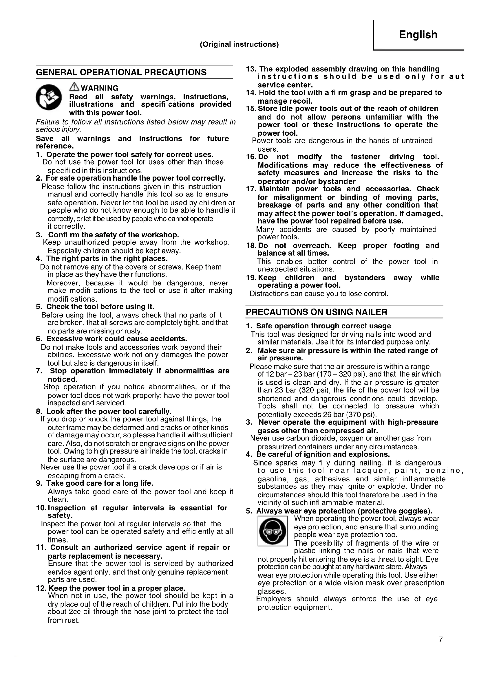 When engaged in nailing work please wear ear muffl ers and head protection. Also, depending on condition, ensure that surrounding people also wear ear muffl ers and head protection. Unprotected exposure to high noise levels can cause permanent, disabling, hearing loss and other problems such as tinnitus (ringing, buzzing, whistling or humming in the ears). Risk assessment and implementation of appropriate controls for these hazards are essential. Appropriate controls to reduce the risk may include actions such as damping materials to prevent workpieces from “ringing”. Operate and maintain the tool as recommended in these instructions, to prevent an unnecessary increase in noise levels.