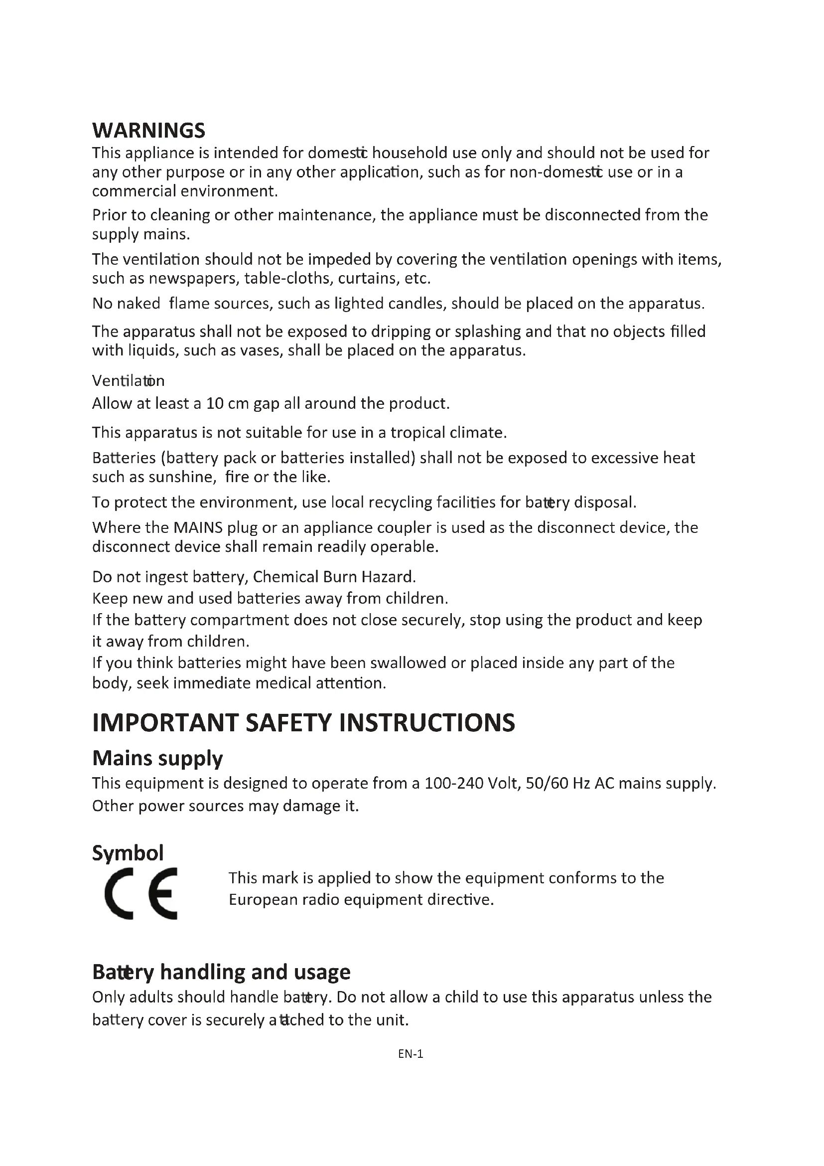 Mains supply This equipment is designed to operate from a 100-240 Volt, 50/60 Hz AC mains supply. Other power sources may damage it. Symbol This mark is applied to show the equipment conforms to the European radio equipment direcve. Ba ery handling and usage Only adults should handle ba ery. Do not allow a child to use this apparatus unless the