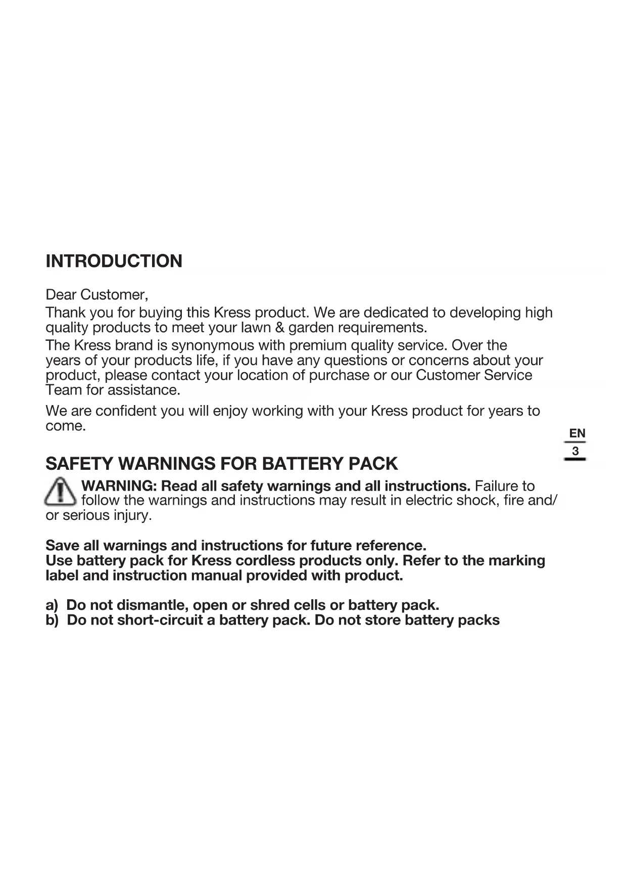 INTRODUCTION Dear Customer, Thank you for buying this Kress product. We are dedicated to developing high quality products to meet your lawn & garden requirements. The Kress brand is synonymous with premium quality service. Over the years of your products life, if you have any questions or concerns about your product, please contact your location of purchase or our Customer Service Team for assistance. We are condent you will enjoy working with your Kress product for years to come.