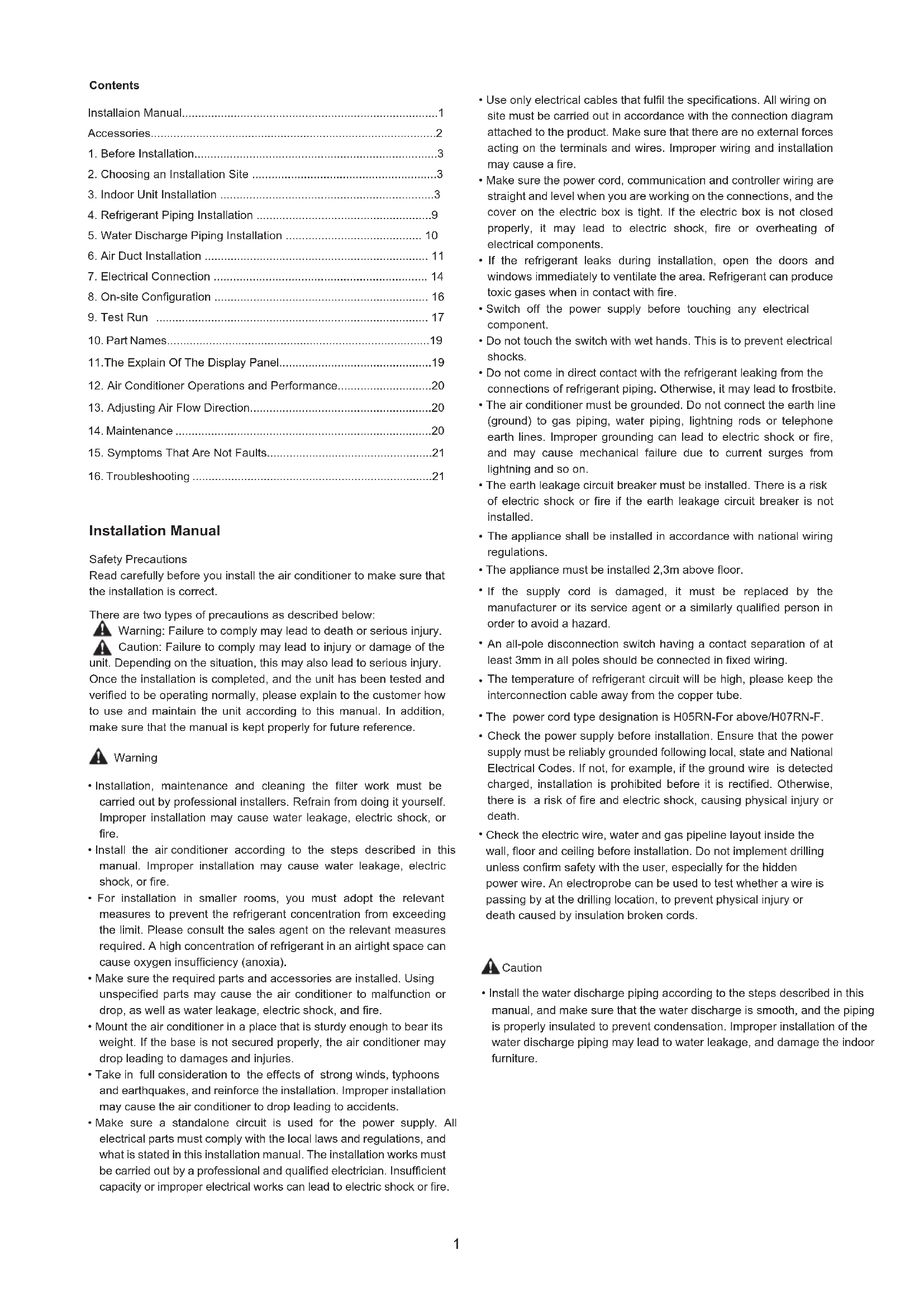 - Install the water discharge piping according to the steps described in this manual, and make sure that the water discharge is smooth, and the piping is properly insulated to prevent condensation. Improper installation of the water discharge piping may lead to water leakage, and damage the indoor furniture. The appliance shall be installed in accordance with national wiring regulations. The appliance must be installed 2,3m above floor. If the supply cord is damaged, it must be replaced by the manufacturer or its service agent or a similarly qualified person in order to avoid a hazard. An all-pole disconnection switch having a contact separation of at least 3mm in all poles should be connected in fixed wiring. The temperature of refrigerant circuit will be high, please keep the interconnection cable away from the copper tube. The power cord type designation is H05RN-For above/H07RN-F.
