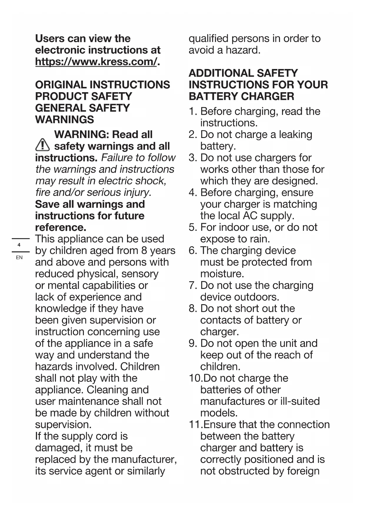 Users can view the electronic instructions at https://www.kress.com/. ORIGINAL INSTRUCTIONS PRODUCT SAFETY GENERAL SAFETY WARNINGS