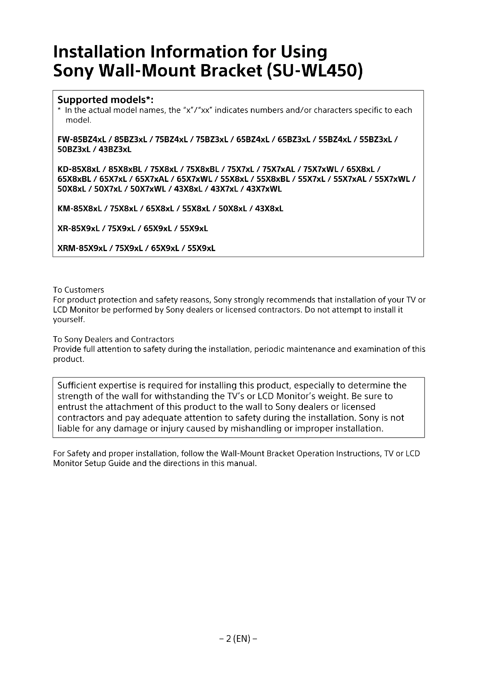 - In the actual model names, the “x”/“xx” indicates numbers and/or characters specific to each model. FW-85BZ4xL / 85BZ3xL / 75BZ4xL / 75BZ3xL / 65BZ4xL / 65BZ3xL / 55BZ4xL / 55BZ3xL / 50BZ3xL / 43BZ3xL KD-85X8xL / 85X8xBL / 75X8xL / 75X8xBL / 75X7xL / 75X7xAL / 75X7xWL / 65X8xL / 65X8xBL / 65X7xL / 65X7xAL / 65X7xWL / 55X8xL / 55X8xBL / 55X7xL / 55X7xAL / 55X7xWL / 50X8xL / 50X7xL / 50X7xWL / 43X8xL / 43X7xL / 43X7xWL KM-85X8xL / 75X8xL / 65X8xL / 55X8xL / 50X8xL / 43X8xL XR-85X9xL / 75X9xL / 65X9xL / 55X9xL XRM-85X9xL / 75X9xL / 65X9xL / 55X9xL To Customers For product protection and safety reasons, Sony strongly recommends that installation of your TV or LCD Monitor be performed by Sony dealers or licensed contractors. Do not attempt to install it yourself. To Sony Dealers and Contractors Provide full attention to safety during the installation, periodic maintenance and examination of this product. Sufficient expertise is required for installing this product, especially to determine the strength of the wall for withstanding the TV’s or LCD Monitor’s weight. Be sure to entrust the attachment of this product to the wall to Sony dealers or licensed contractors and pay adequate attention to safety during the installation. Sony is not liable for any damage or injury caused by mishandling or improper installation. For Safety and proper installation, follow the Wall-Mount Bracket Operation Instructions, TV or LCD Monitor Setup Guide and the directions in this manual.− 3 (EN) −