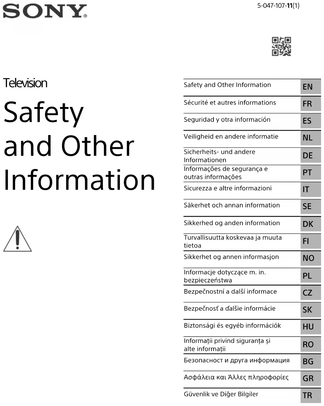- You can refer to the Help Guide with your smartphone (visit website provided on the front cover of Reference Guide). IMPORTANT - Read the End User Software Licence Agreement before using your Sony product.* Using your product indicates your acceptance of the End User Software Licence Agreement. The software licence agreement between you and Sony is available online at Sony website (https://www.sony.net/tv-software-licenses/) or on your product screen. Press (Quick Settings) on the remote control and select [Settings] t [System] t [About] t [Legal information] t [Notices and licences].Internet Connection and Data PrivacyThis product connects to the internet during initial setup as soon as a network is connected in order to confirm internet connection, and later to configure the Home screen. Your IP address is used in these and all other internet connections. If you do not want your IP address be used at all, do not set-up the wireless internet function and do not connect an internet cable. Please refer to the privacy information presented in the set-up screens for further details of internet connections. FUSE IMPORTANT NOTICE This product has been manufactured by or on behalf of Sony Corporation.EU and UK Importer: Sony Europe B.V.Inquiries to the EU Importer or related to product compliance in Europe should be sent to the manufacturer’s authorized representative, Sony Belgium, bijkantoor van Sony Europe B.V., Da Vincilaan 7-D1, 1930 Zaventem, Belgium.Inquiries to the UK Importer or related to product compliance in the UK should be sent to the manufacturer’s authorized representative, Sony Europe B.V., The Heights, Brooklands, Weybridge, Surrey KT13 0XW, United Kingdom. Safety InformationC:\Users\User\Desktop\Safety\SY23_SAFETY_EU_111\01EN\5047107111_01EN.fm master page: Right Safety and Other Information 5-047-107-11(1)