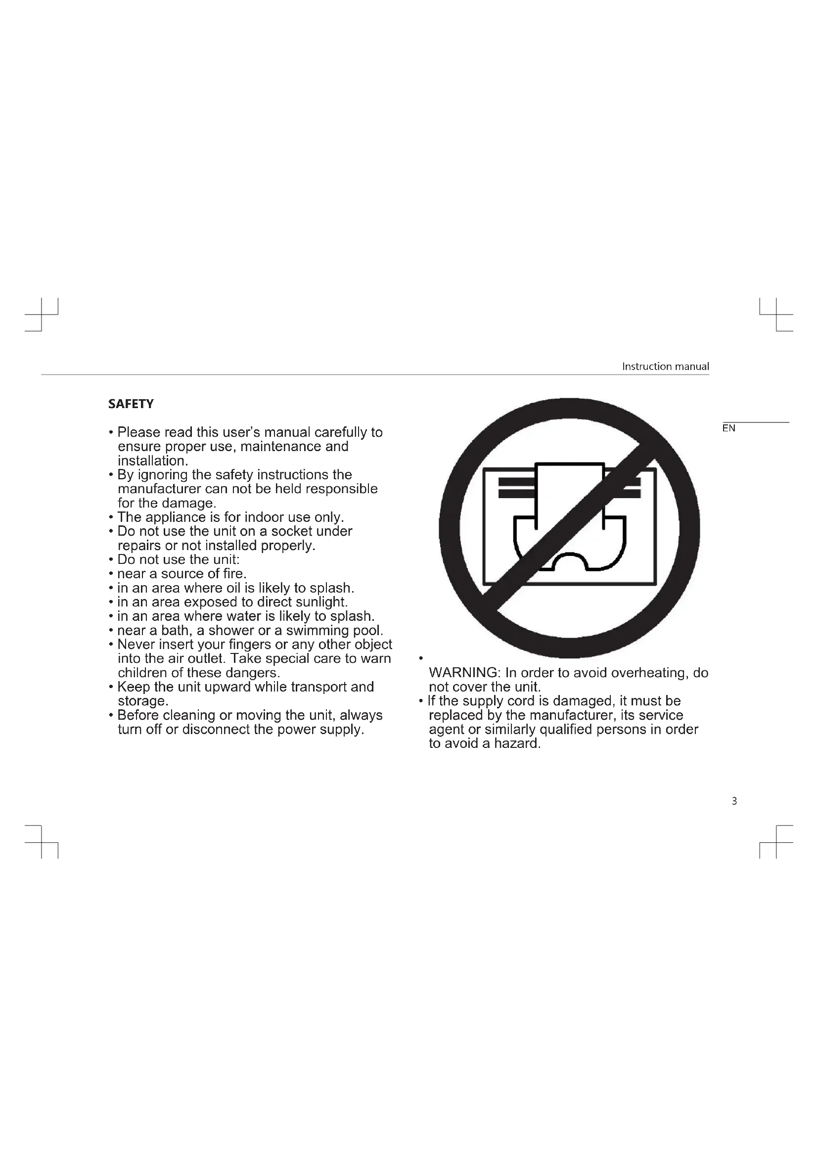 - If the supply cord is damaged, it must be replaced by the manufacturer, its service agent or similarly qualified persons in order to avoid a hazard. ENInstruction manual
