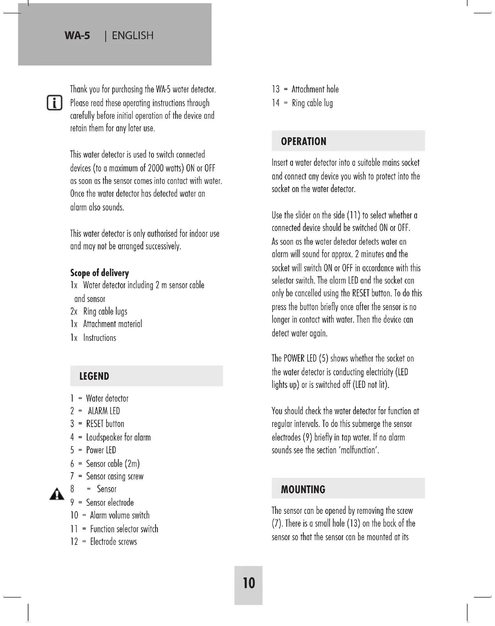 13 = Attachment hole 14 = Ring cable lug OPERATION Insert a water detector into a suitable mains socket and connect any device you wish to protect into the socket on the water detector. Use the slider on the side (11) to select whether a connected device should be switched ON or OFF. As soon as the water detector detects water an alarm will sound for approx. 2 minutes and the socket will switch ON or OFF in accordance with this selector switch. The alarm LED and the socket can only be cancelled using the RESET button. To do this press the button briefly once after the sensor is no longer in contact with water. Then the device can detect water again. The POWER LED (5) shows whether the socket on the water detector is conducting electricity (LED lights up) or is switched off (LED not lit). You should check the water detector for function at regular intervals. To do this submerge the sensor electrodes (9) briefly in tap water. If no alarm sounds see the section ‘malfunction’. MOUNTING The sensor can be opened by removing the screw (7). There is a small hole (13) on the back of the sensor so that the sensor can be mounted at its Thank you for purchasing the WA-5 water detector. Please read these operating instructions through carefully before initial operation of the device and retain them for any later use. This water detector is used to switch connected devices (to a maximum of 2000 watts) ON or OFF as soon as the sensor comes into contact with water. Once the water detector has detected water an alarm also sounds. This water detector is only authorised for indoor use and may not be arranged successively. Scope of delivery 1x Water detector including 2 m sensor cable and sensor 2x Ring cable lugs 1x Attachment material 1x Instructions LEGEND 1 = Water detector 2 = ALARM LED 3 = RESET button 4 = Loudspeaker for alarm 5 = Power LED 6 = Sensor cable (2m) 7 = Sensor casing screw 8 = Sensor 9 = Sensor electrode 10 = Alarm volume switch 11 = Function selector switch 12 = Electrode screws RECEIVERENGLISH | WA-5