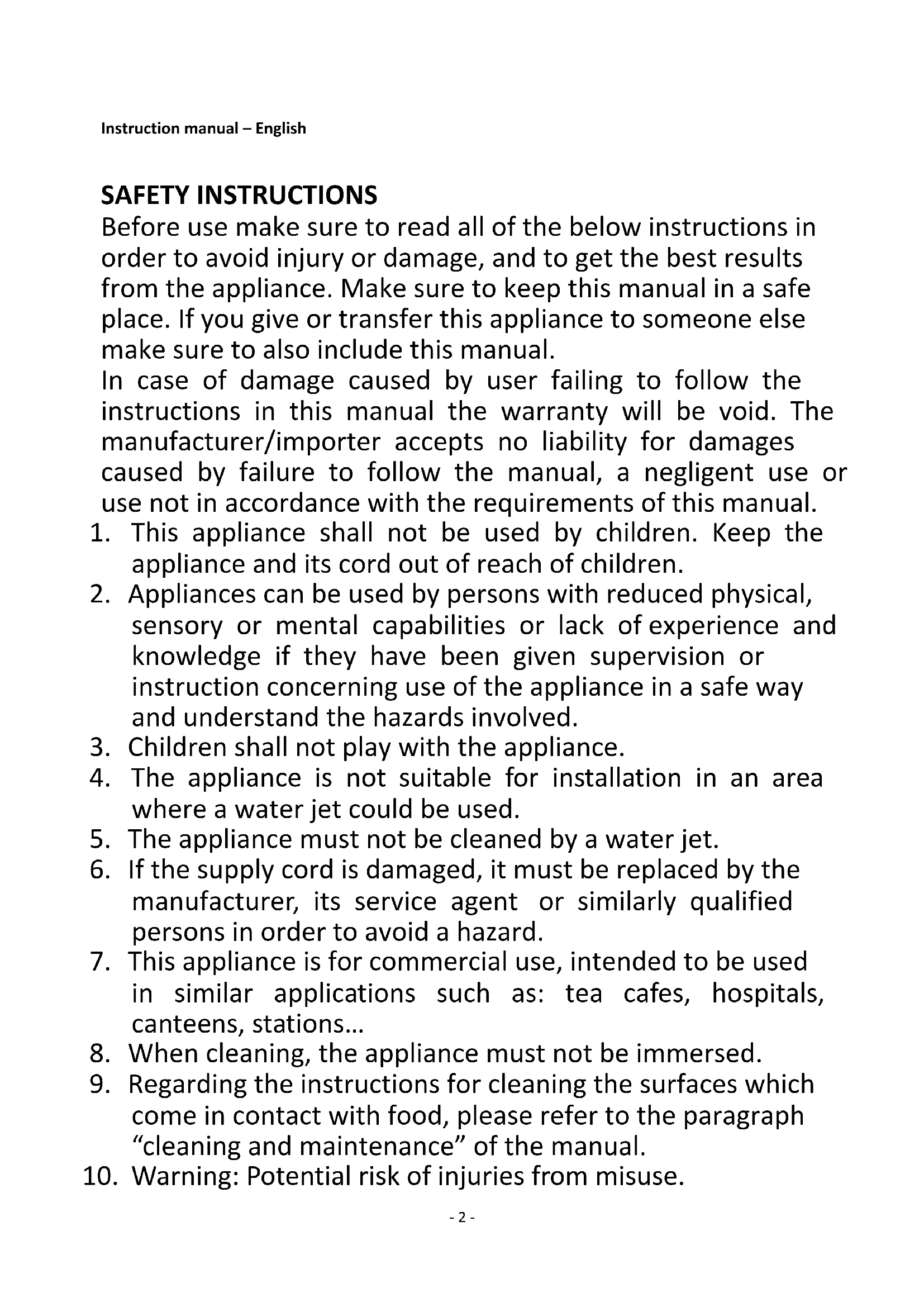 7. This appliance is for commercial use, intended to be used