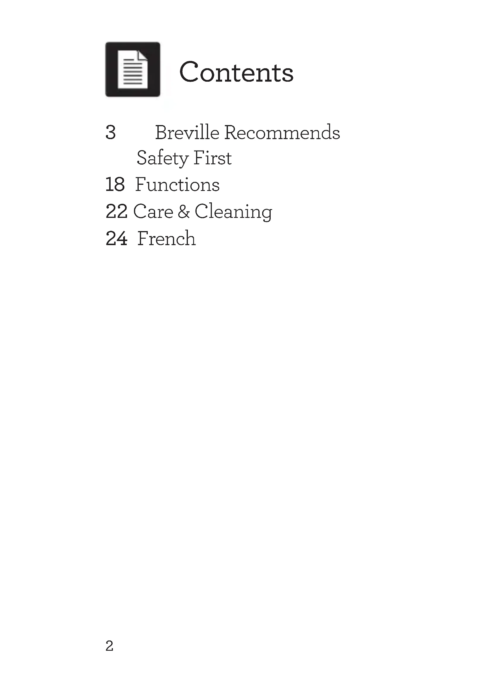 Sous Vide Instruction Book CS10001A & CS20001A2 3 Breville Recommends Safety First 18 Functions 22 Care & Cleaning 24 French Contents3 BREVILLE RECOMMENDS SAFETY FIRST At Breville we are very safety conscious. We design and manufacture consumer products with the safety of you, our valued customer, foremost in mind. In addition, we ask that you exercise a degree of care when using any electrical appliance and adhere to the following precautions.4 IMPORTANT SAFEGUARDS READ ALL INSTRUCTIONS