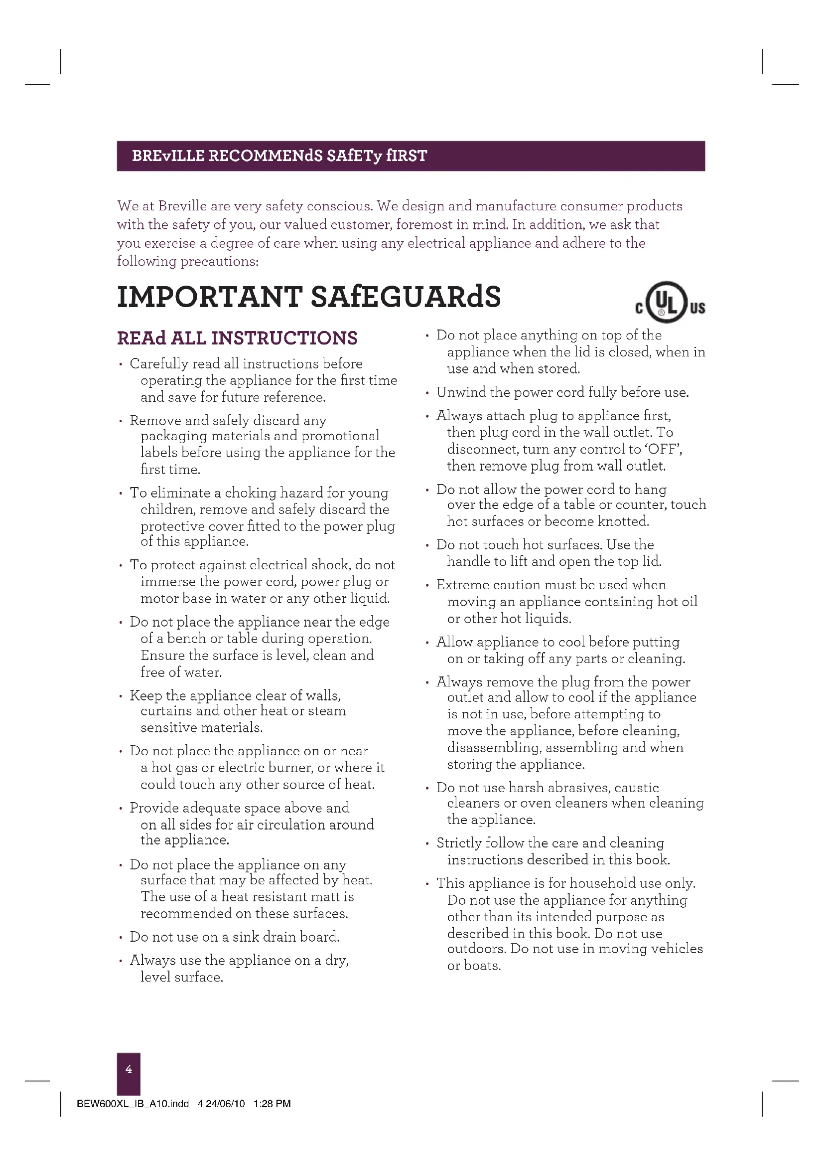 - This appliance is for household use only. Do not use the appliance for anything other than its intended purpose as described in this book. Do not use outdoors. Do not use in moving vehicles or boats. IMPORTANT SAfEGUARdS BEW600XL_IB_A10.indd 4 24/06/10 1:28 PM5 BREvILLE RECOMMENdS SAfETy fIRST