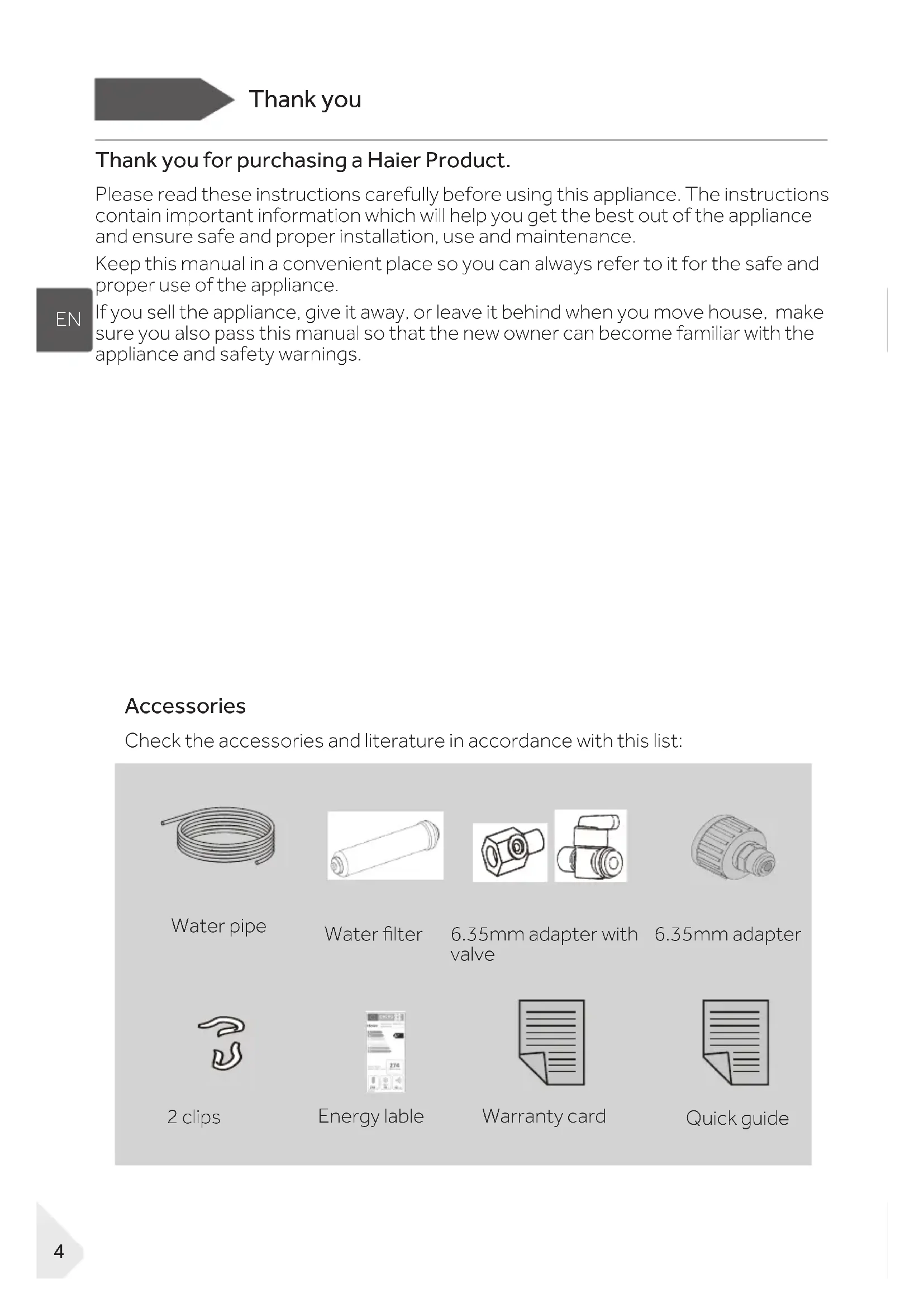 - Customer service 3EN Thank you Thank you for purchasing a Haier Product. Please read these instructions carefully before using this appliance. The instructions contain important information which will help you get the best out of the appliance and ensure safe and proper installation, use and maintenance. Keep this manual in a convenient place so you can always refer to it for the safe and proper use of the appliance. If you sell the appliance, give it away, or leave it behind when you move house, make sure you also pass this manual so that the new owner can become familiar with the appliance and safety warnings. Accessories Check the accessories and literature in accordance with this list: Energy lable Quick guide Warranty card 6.35mm adapter with valve 6.35mm adapter 2 clips Water lter Water pipe 4EN WARNING – Important Safety information NOTICE-General information and tips Environmental information Safety information Disposal Help protect the environment and human health. Put the packaging in applicable containers to recycle it. Help to recycle waste of electrical and electronic appliances. Do not dispose appliances marked with this symbol with the house- hold waste. Return the product to your local recycling facility or contact your municipal oce. WARNING! Risk of injury or suocation! Refrigerants and gases must be disposed of professionally. Ensure that the tubing of the refrigerant circuit is not damaged before being properly disposed of. Disconnect the appliance from the mains supply. Cut o the mains cable and dispose of it. Remove the trays and drawers as well as the door catch and seals, to prevent children and pets to get closed in the appliance. 5EN Safety information Before switching on the appliance for the rst time read the following safety hints!: WARNING! Before rst use ▶ Make sure there is no transport damage. ▶ Remove all packaging and keep out of children´s reach. ▶ Wait at least two hours before installing the appliance in order to ensure the re- frigerant circuit is fully ecient. ▶ Handle the appliance always with at least two persons because it is heavy. Installation ▶ The appliance should be placed in a well-ventilated place. Ensure a space of at least 10 cm above and around the appliance. ▶ Never place the appliance in a damp area or location where it might be splashed with water. Clean and dry water splashes and stains with a soft clean cloth. ▶ Do not install the appliance in direct sunlight or in the near of heat sources(e.g. stoves, heaters). ▶ Install and level the appliance in an area suitable for its size and use. ▶ Keep ventilation openings in the appliance or in the in-built structure clear of obstruction. ▶ Make sure that the electrical information on the rating plate agrees with the power supply. If it does not, contact an electrician. ▶ The appliance is operated by a 220-240 VAC/50 Hz power supply. Abnormal voltage uctuation may cause the appliance to fail to start, or damage to the temperature control or compressor, or there may be an abnormal noise when operating. In such case, an automatic regulator shall be mounted. ▶ Do not use multi-plug adapters and extension cables. ▶ Do not locate multiple portable socket-outlets or portable power supplies at the rear of the appliance. ▶ Ensure that the power cable is not trapped by the refrigerator. Do not step on the power cable. 6EN Safety information WARNING! ▶ Use a separate earthed socket for the power supply which is easy accessible. The appliance must be earthed. Only for UK: The appliance’s power cable is tted with 3-cord (grounding) plug that ts a standard 3-cord (grounded) socket. Never cut o or dismount the third pin (grounding). After the appliance is installed, the plug should be acces- sible. ▶ Do not damage the refrigerant circuit. Daily use ▶ This appliance can be used by children aged from 8 years and above and persons with reduced physical, sensory or mental capabilities or lack of experience and knowledge if they have been given supervision or instruction concerning use of the appliance in a safe way and understand the hazards involved. ▶ Children aged from 3 to 8 years are allowed to load and unload, but not allowed to clean or install the refrigerating appliances. ▶ Keep away children under 3 years of age from the appliance unless they are con- stantly supervised. ▶ Children shall not play with the appliance. ▶ If coal gas or other inammable gas is leaking in the vicinity of the appliance, turn o the valve of the leaking gas, open the doors and windows and do not unplug a plug in the power cable of the refrigerator or any other appliance. ▶ Notice that the appliance is set for operation at a specic ambient range be- tween 10 and 43°C. The appliance may not work properly if it is left for a long period at a temperature above or below the indicated range. ▶ Do not place unstable articles (heavy objects, containers lled with water) on top of the refrigerator, to ovoid personal injury caused by falling or electric shock caused by contact with water. ▶ Do not pull on the door shelves. The door may be pulled slant, the bottle rack, may be pulled away, or the appliance may topple. ▶ Open and close the doors only with the handles. The gap between the doors and between the doors and the cabinet is very narrow. Do not extend your hands in these areas to avoid pinching your ngers. Open or close the refrigerator doors only when there are no children standing within the range of door movement. 7EN Safety information WARNING! ▶ Do not store or use inammable, explosive or corrosive materials in the appli- ance or in the vicinity. ▶ Do not store medicines, bacteria or chemical agents in the appliance. This ap- pliance is a household appliance. It is not recommended to store materials that require strict temperatures. ▶ Never store liquids in bottles or cans (besides high percentage spirits) especially carbonated beverages in the freezer, as t