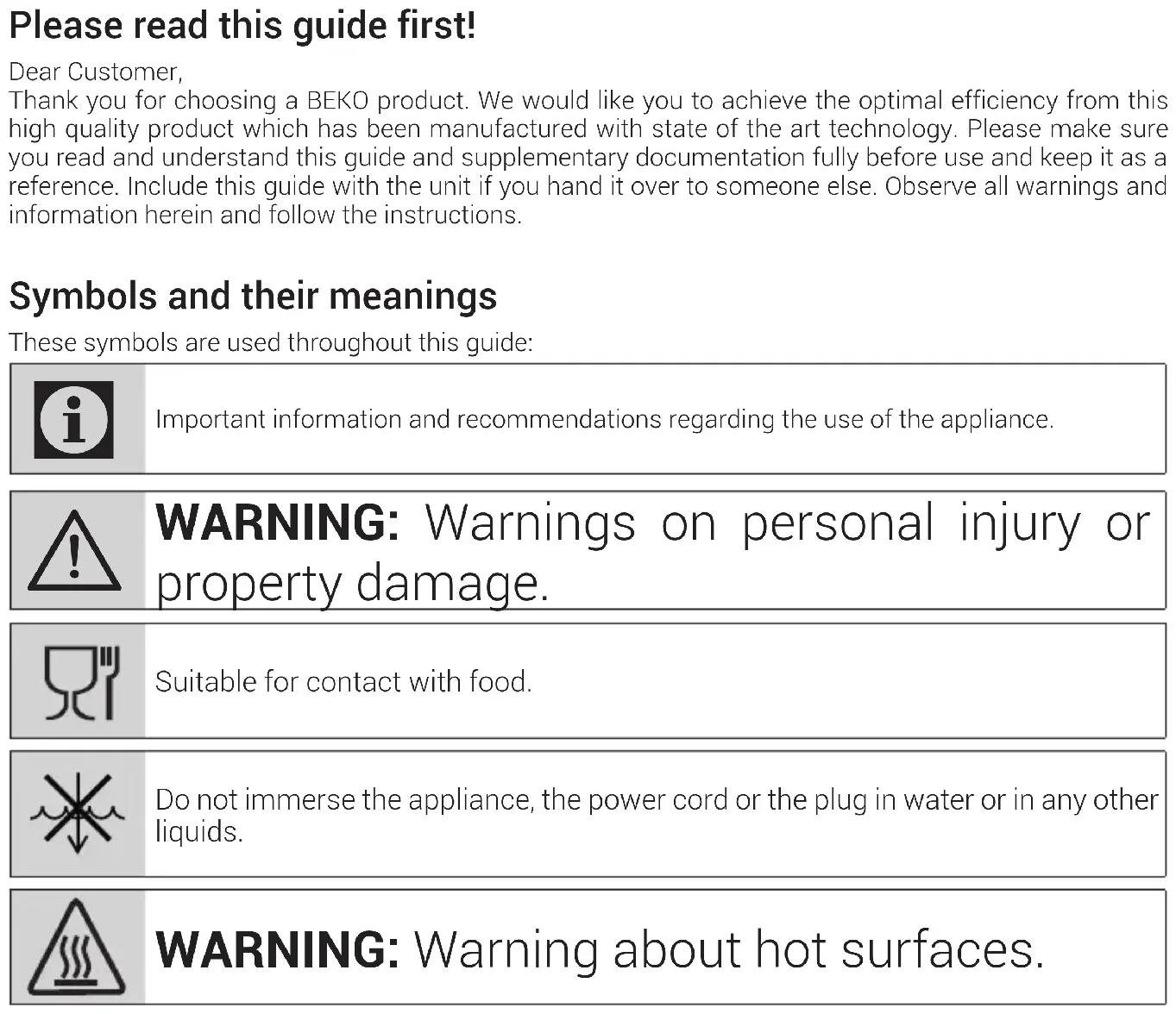 RUSSIAN 99-124 ITALIANO 125-144 POLSKI 145-163 СРБИН 164-180 БЪЛГАРСКИ 181-198 УКРАЇНСЬКА 199-217Please read this guide first! Dear Customer,Thank you for choosing a BEKO product. We would like you to achieve the optimal efficiency from this high quality product which has been manufactured with state of the art technology. Please make sure you read and understand this guide and supplementary documentation fully before use and keep it as a reference. Include this guide with the unit if you hand it over to someone else. Observe all warnings and information herein and follow the instructions. Symbols and their meanings These symbols are used throughout this guide: Important information and recommendations regarding the use of the appliance.