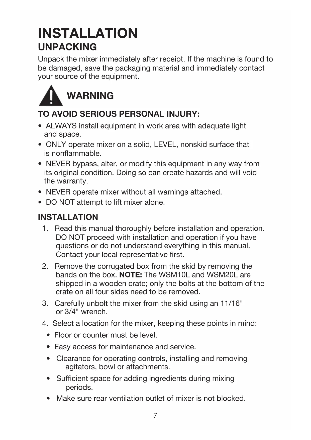 INSTALLATION UNPACKING Unpack the mixer immediately after receipt. If the machine is found to be damaged, save the packaging material and immediately contact your source of the equipment. WARNING TO AVOID SERIOUS PERSONAL INJURY: