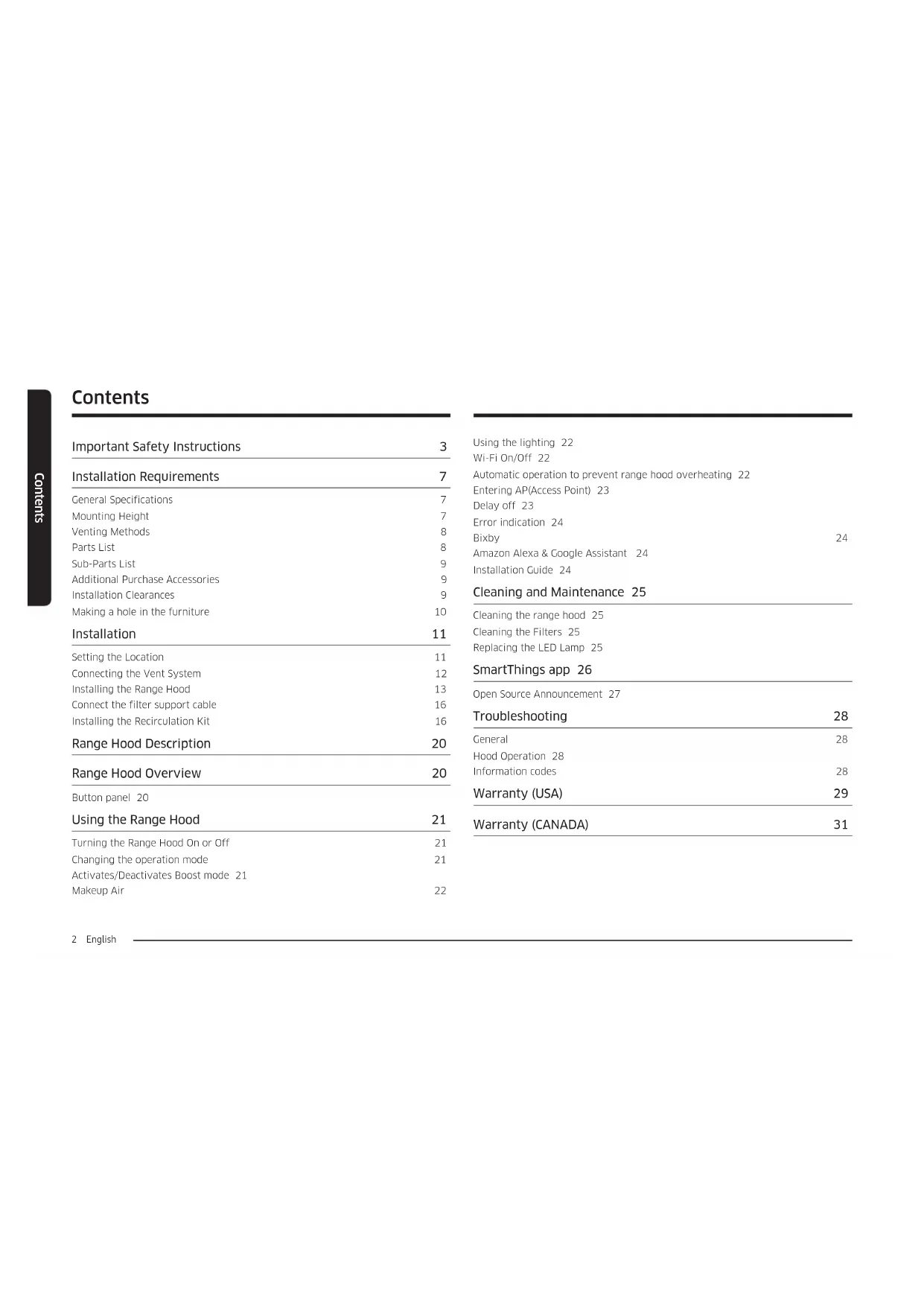 Range Hood Installation & User Manual NK30CB600W**/NK36CB600W**2 English Contents Using the lighting 22 Wi-Fi On/Off 22 Automatic operation to prevent range hood overheating 22 Entering AP(Access Point) 23 Delay off 23 Error indication 24 Bixby 24 Amazon Alexa & Google Assistant 24 Installation Guide 24 Cleaning and Maintenance 25 Cleaning the range hood 25 Cleaning the Filters 25 Replacing the LED Lamp 25 SmartThings app 26 Open Source Announcement 27 Troubleshooting 28 General 28 Hood Operation 28 Information codes 28 Warranty (USA) 29 Warranty (CANADA) 31 Contents Important Safety Instructions 3 Installation Requirements 7 General Specifications 7 Mounting Height 7 Venting Methods 8 Parts List 8 Sub-Parts List 9 Additional Purchase Accessories 9 Installation Clearances 9 Making a hole in the furniture 10 Installation 11 Setting the Location 11 Connecting the Vent System 12 Installing the Range Hood 13 Connect the filter support cable 16 Installing the Recirculation Kit 16 Range Hood Description 20 Range Hood Overview 20 Button panel 20 Using the Range Hood 21 Turning the Range Hood On or Off 21 Changing the operation mode 21 Activates/Deactivates Boost mode 21 Makeup Air 22English 3English 3 Important Safety Instructions Important Safety Instructions APPROVED FOR RESIDENTIAL APPLIANCES FOR RESIDENTIAL USE ONLY