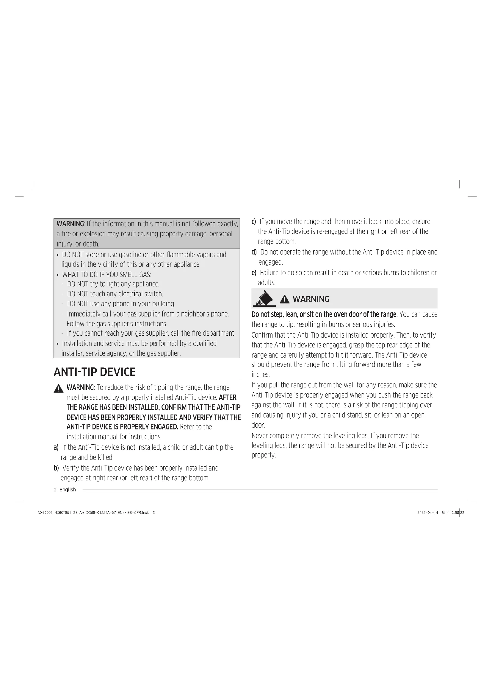 must be secured by a properly installed Anti-Tip device. AFTER THE RANGE HAS BEEN INSTALLED, CONFIRM THAT THE ANTI-TIP DEVICE HAS BEEN PROPERLY INSTALLED AND VERIFY THAT THE ANTI-TIP DEVICE IS PROPERLY ENGAGED. Refer to the installation manual for instructions. a) If the Anti-Tip device is not installed, a child or adult can tip the range and be killed. b) Verify the Anti-Tip device has been properly installed and engaged at right rear (or left rear) of the range bottom. c) If you move the range and then move it back into place, ensure the Anti-Tip device is re-engaged at the right or left rear of the range bottom. d) Do not operate the range without the Anti-Tip device in place and engaged. e) Failure to do so can result in death or serious burns to children or adults. WARNING Do not step, lean, or sit on the oven door of the range. You can cause the range to tip, resulting in burns or serious injuries. Conrm that the Anti-Tip device is installed properly. Then, to verify that the Anti-Tip device is engaged, grasp the top rear edge of the range and carefully attempt to tilt it forward. The Anti-Tip device should prevent the range from tilting forward more than a few inches. If you pull the range out from the wall for any reason, make sure the Anti-Tip device is properly engaged when you push the range back against the wall. If it is not, there is a risk of the range tipping over and causing injury if you or a child stand, sit, or lean on an open door. Never completely remove the leveling legs. If you remove the leveling legs, the range will not be secured by the Anti-Tip device properly. NX9000T_NX60T8511SS_AA_DG68-01221A-07_EN+MES+CFR.indb 2NX9000T_NX60T8511SS_AA_DG68-01221A-07_EN+MES+CFR.indb 2 2022-04-14 오후 12:58:322022-04-14 오후 12:58:32English 3