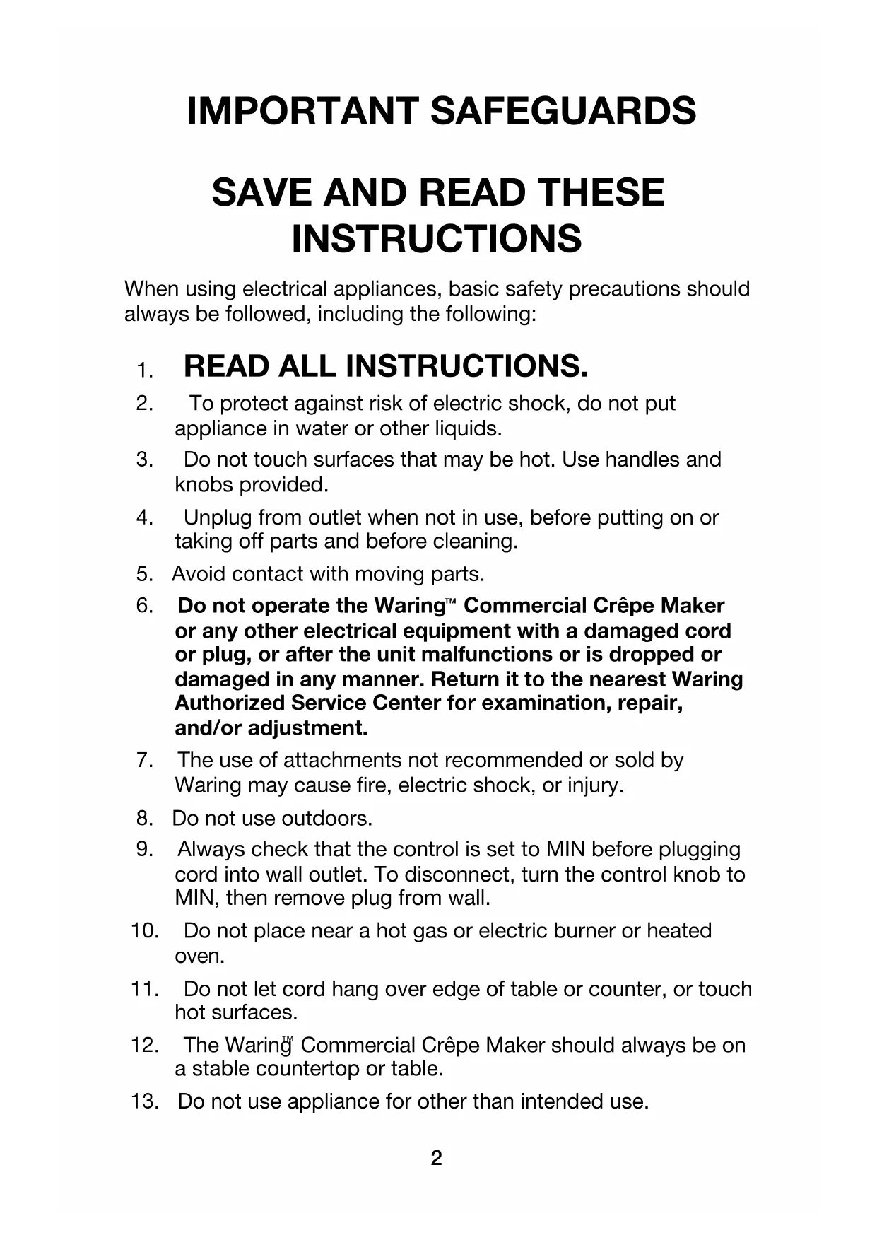 Commercial Crêpe Maker or any other electrical equipment with a damaged cord or plug, or after the unit malfunctions or is dropped or damaged in any manner. Return it to the nearest Waring Authorized Service Center for examination, repair, and/or adjustment.