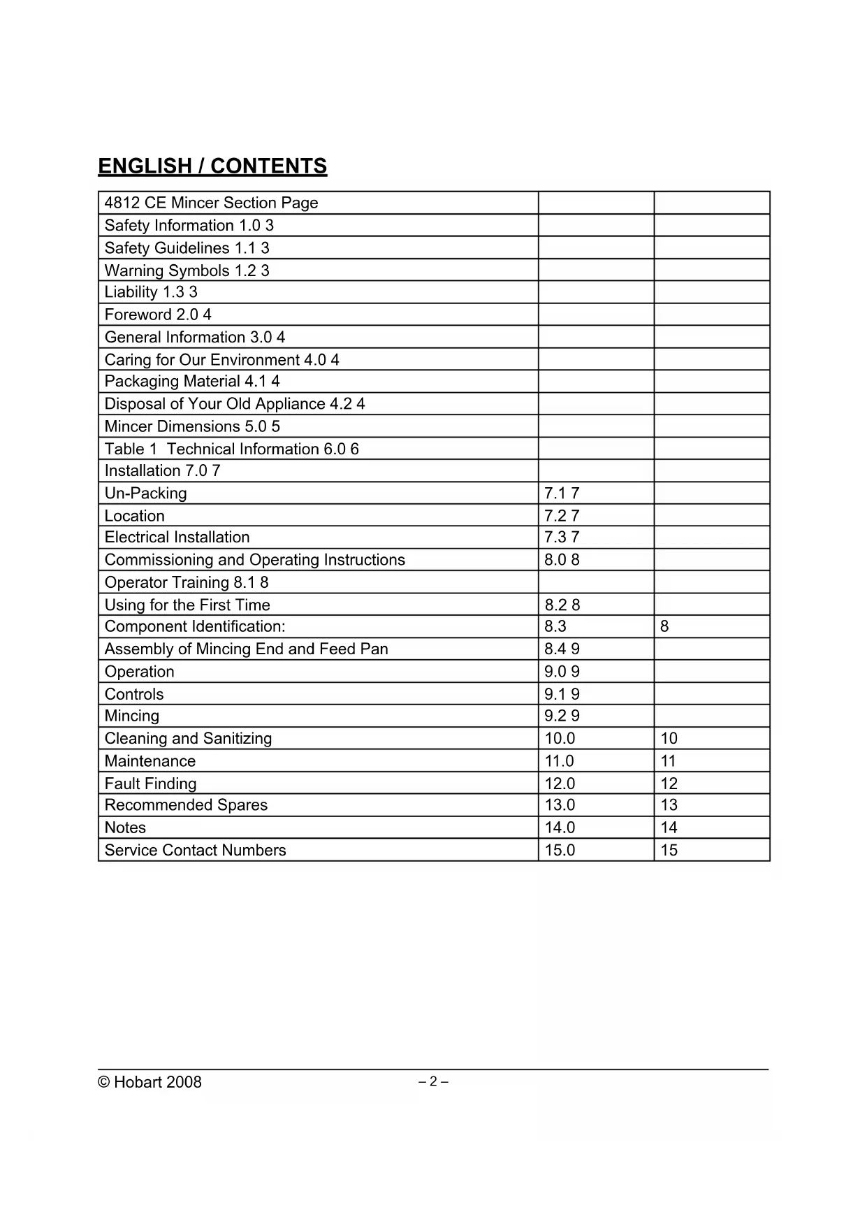 © Hobart 2008 ENGLISH / CONTENTS 4812 CE Mincer Section Page Safety Information 1.0 3 Safety Guidelines 1.1 3 Warning Symbols 1.2 3 Liability 1.3 3 Foreword 2.0 4 General Information 3.0 4 Caring for Our Environment 4.0 4 Packaging Material 4.1 4 Disposal of Your Old Appliance 4.2 4 Mincer Dimensions 5.0 5 Table 1 Technical Information 6.0 6 Installation 7.0 7 Un-Packing 7.1 7 Location 7.2 7 Electrical Installation 7.3 7 Commissioning and Operating Instructions 8.0 8 Operator Training 8.1 8 Using for the First Time 8.2 8 Component Identifi cation: 8.3 8 Assembly of Mincing End and Feed Pan 8.4 9 Operation 9.0 9 Controls 9.1 9 Mincing 9.2 9 Cleaning and Sanitizing 10.0 10 Maintenance 11.0 11 Fault Finding 12.0 12 Recommended Spares 13.0 13 Notes 14.0 14 Service Contact Numbers 15.0 15– 3 –