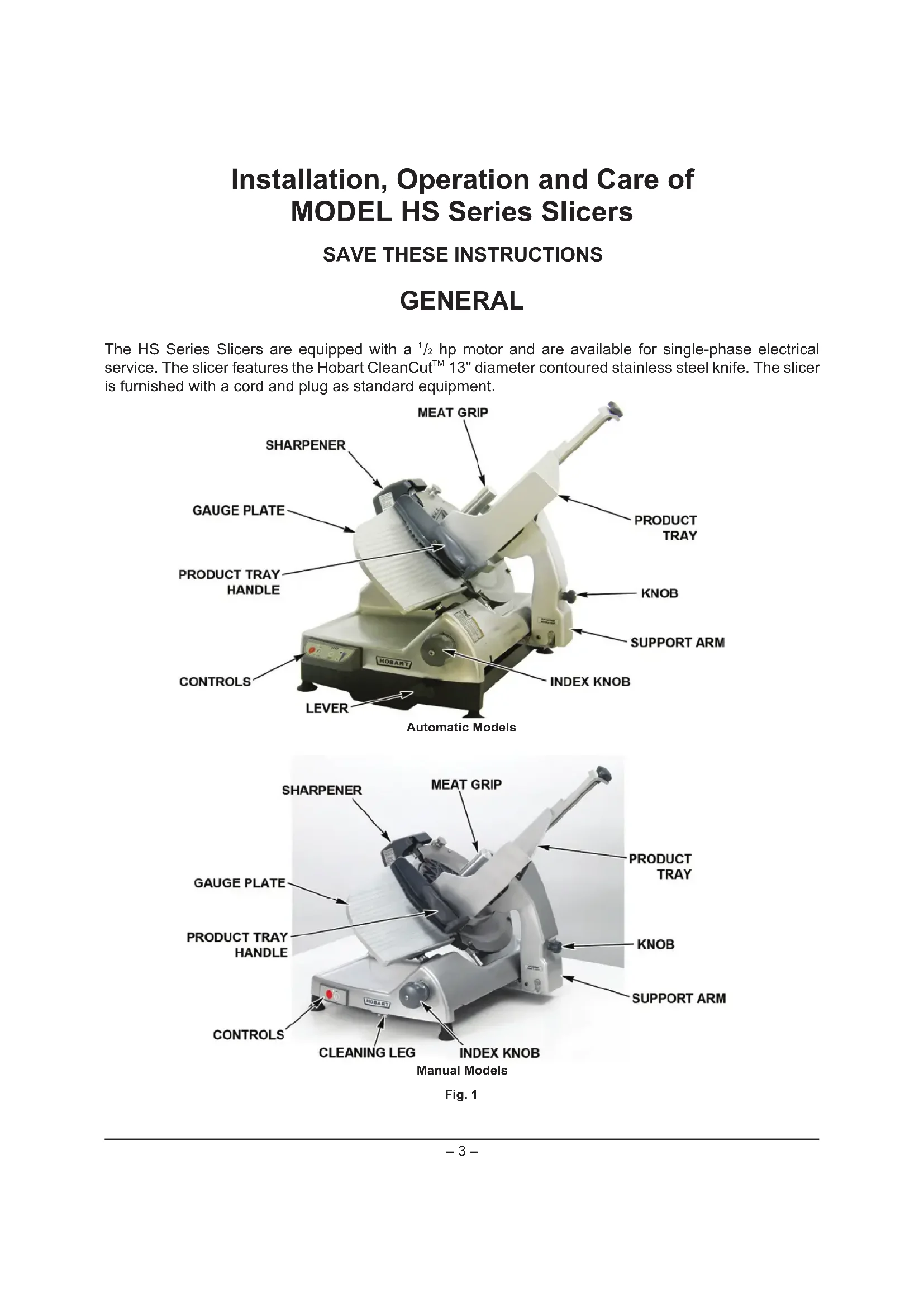 13" diameter contoured stainless steel knife. The slicer is furnished with a cord and plug as standard equipment. Fig. 1Automatic ModelsManual Models– 4 – FEATURES