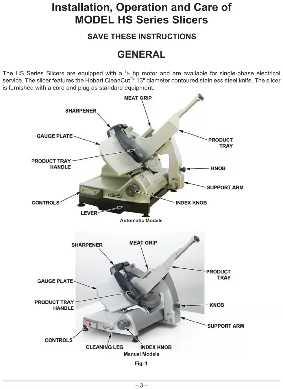 13" diameter contoured stainless steel knife. The slicer is furnished with a cord and plug as standard equipment. Fig. 1Automatic ModelsManual Models– 4 – FEATURES